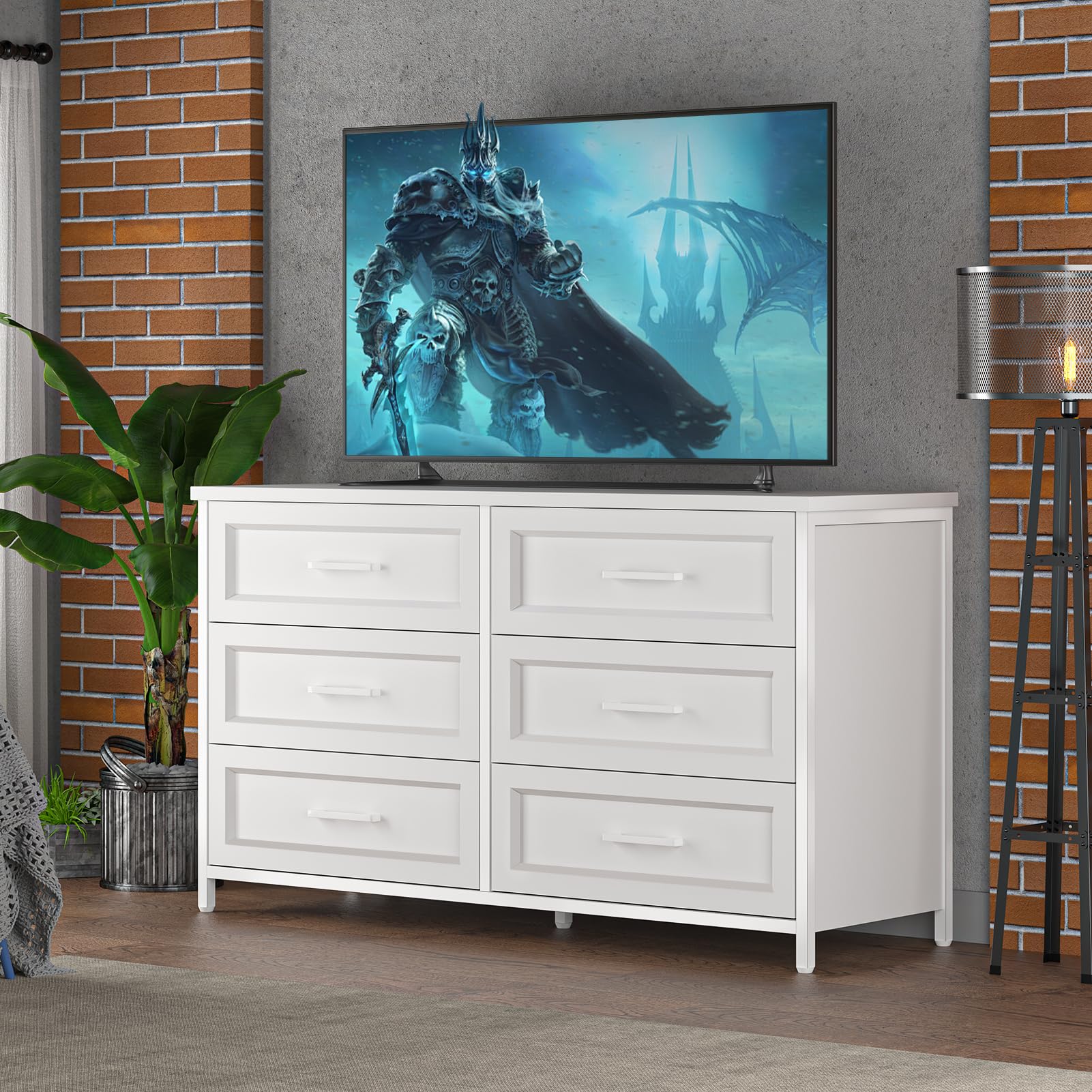 - The elegant framed paneling design, sleek white finish and metal handles and metal legs make the 6 Drawer Chest a perfect complement to your home decor. Smart and compact design for a perfect balance of performance and appearance.