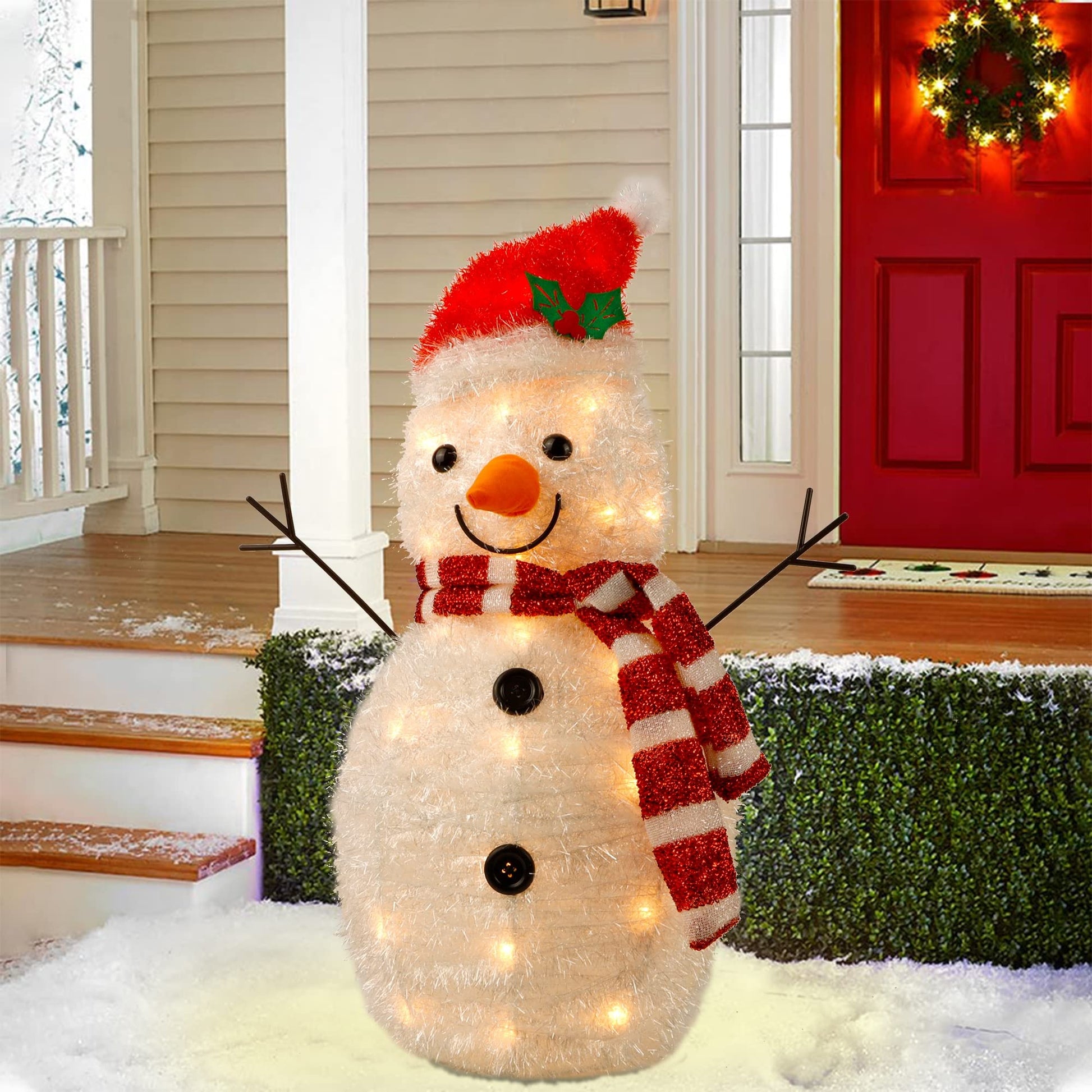 - Christmas Lighted Snowman Decorations: Our 22 inch-light smiling snowman wearing a red Christmas hat and a striped scarf is ready for holiday. The tree branch hands and long yellow nose make the snowman look more attractive and lovely, it is a perfect indoor-outdoor Christmas decoration to greet family.