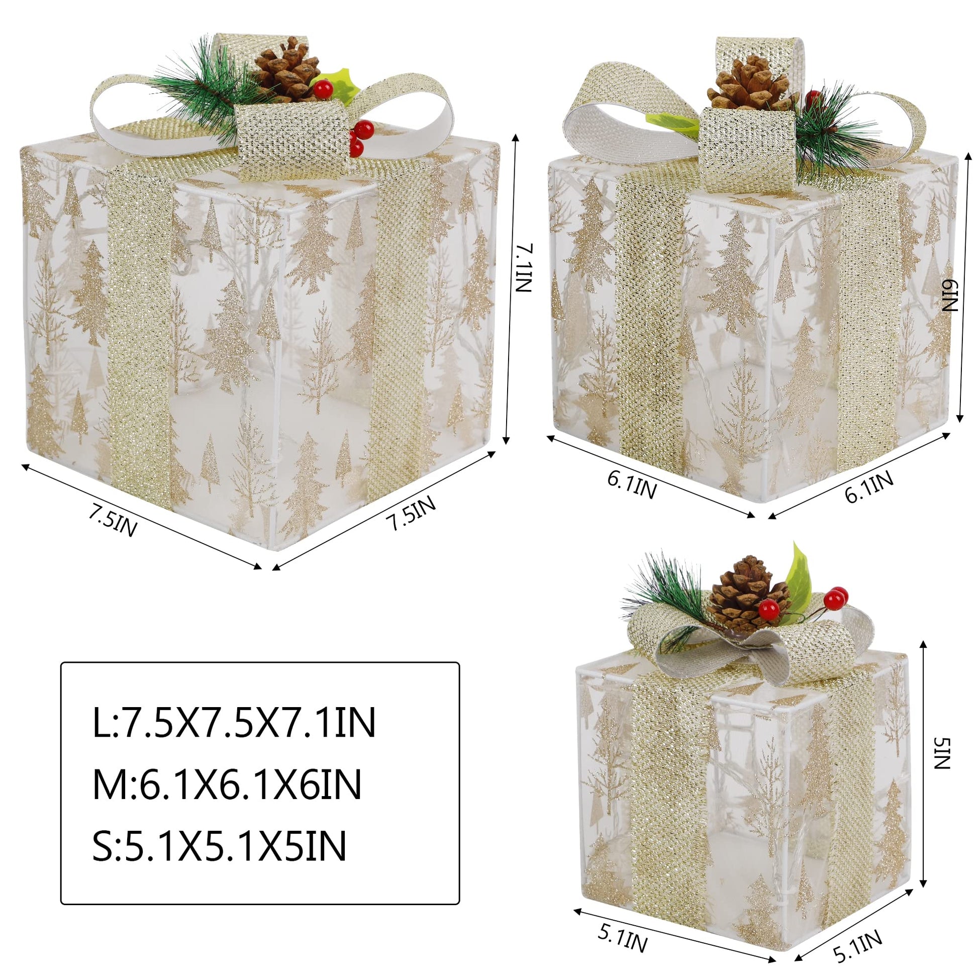 - Light Up Christmas Gift Boxes: Set of 3 organza Christmas gift boxes decorated with 60 LED warm white lights. Decorate with a golden bow and pine cone, red berries are very beautiful, whether placed on the Xmas tree skirt or anywhere you can imagine, they add a festival spirit to Christmas.
