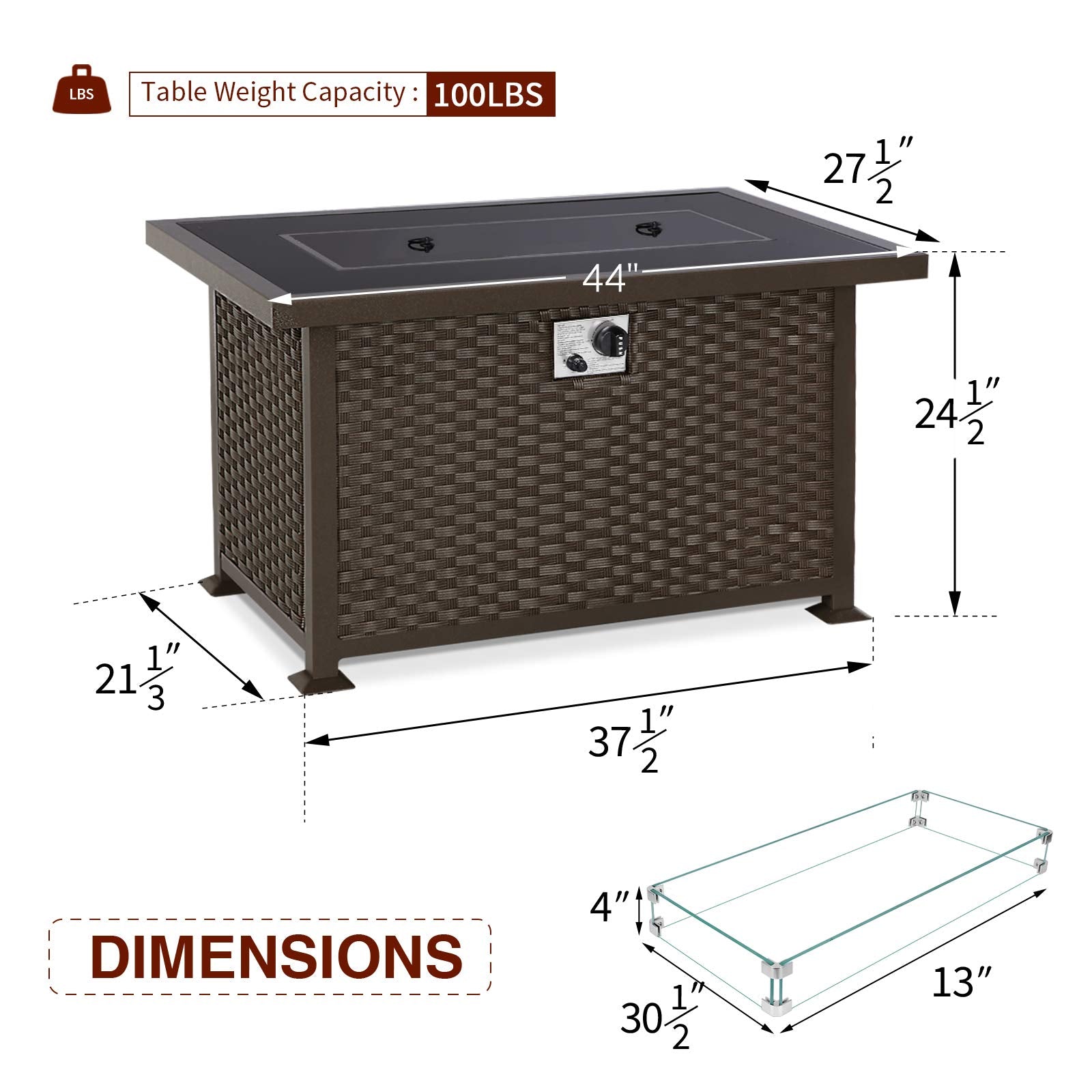 - Dimensions & Packing Included : Overall Table Size: 43.25"L x 27.5"Wx 24.5"H, Unit includes: One Fire Pit Table with Burner Lid, Waterproof(Not Rain-Proof) Fire Pit Cover, Burner with pre-attached 2.4FT Hose & Regulator, Tempered Glass Wind Guard, 11 lbs Ocean Blue Decorative Glass Stone Set, Accessories Bag (Necessary Screws, Nuts & Washers), Product Manual.