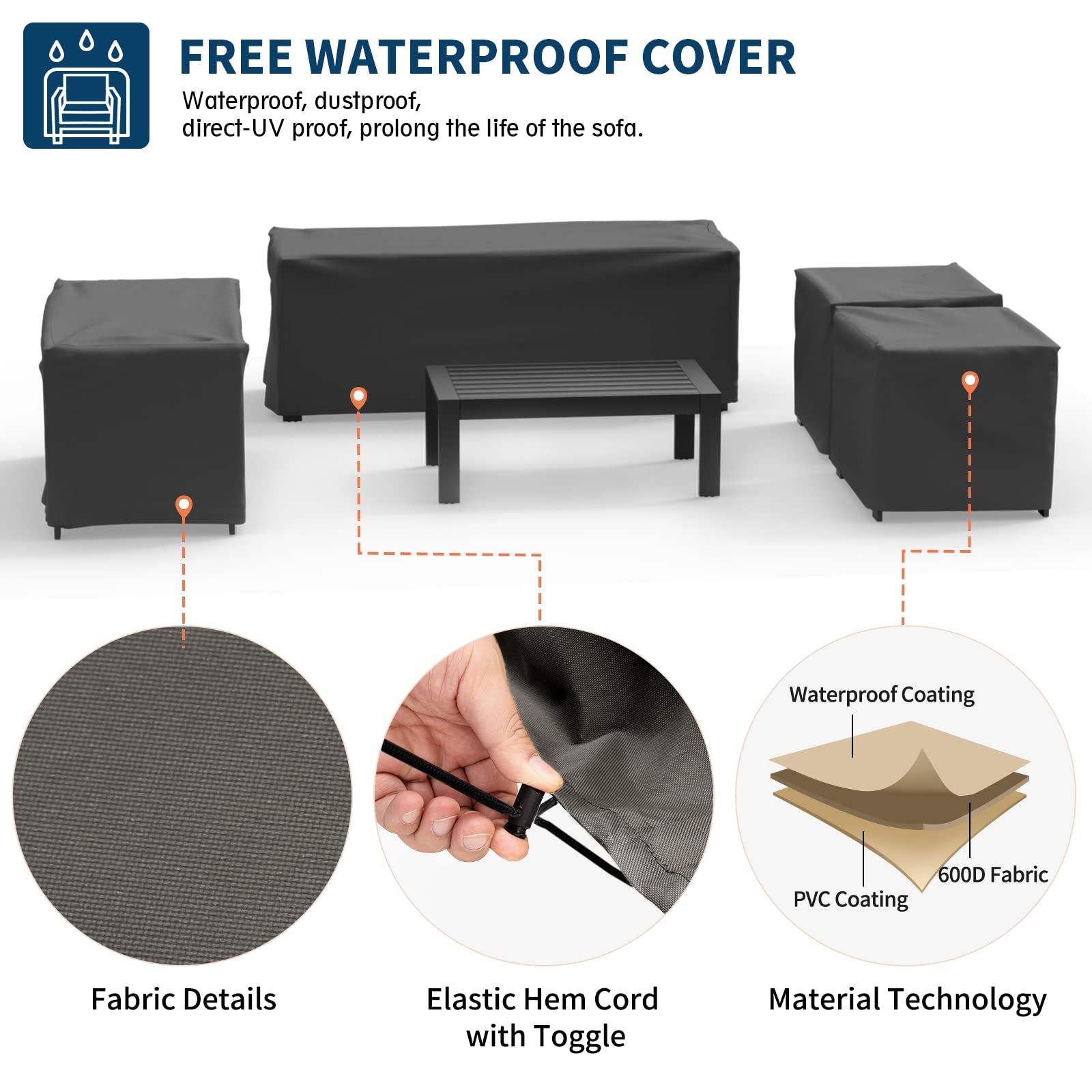 - Included Waterproof Cover: In order to increase the practicality and protection of the outdoor patio furniture, the patio couch comes with 4 waterproof covers. The cover protects your patio furniture from rain, dust, dirt, and sunlight when not in use, preserving its quality and appearance over time.
