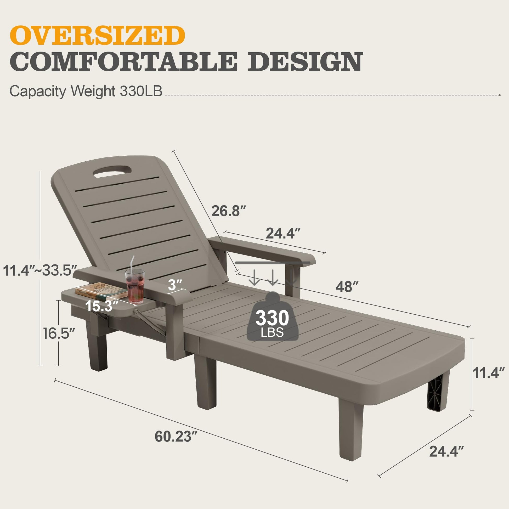 - Spacious & Sturdy This oversized pool lounge chair measures 75"L x 24.4"W x 11.4"H, offering extra width for ultimate relaxation. It is built to hold up to 330LB, providing ample space and durability for all users to enjoy comfortably.