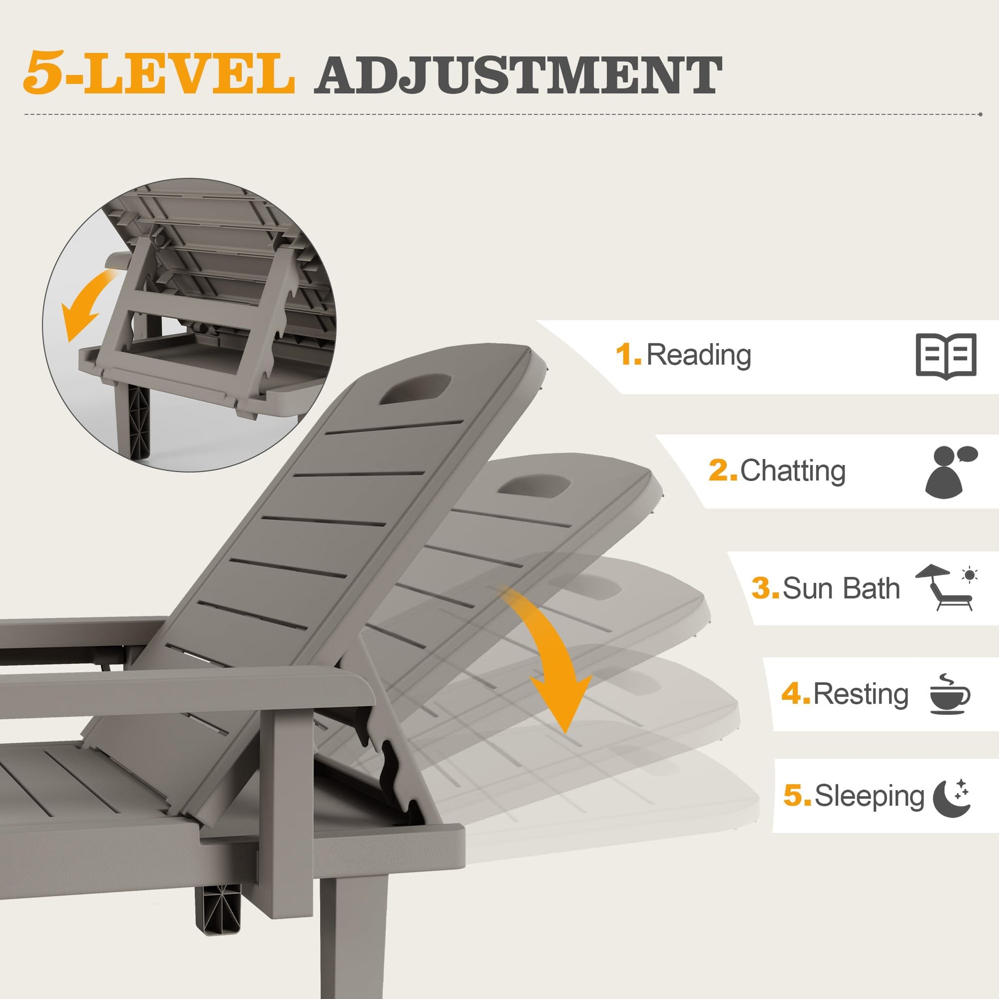 - Easy to Use Designed for quick and easy assembly, this lounge chair takes just 10 minutes to set up. The easy-to-clean plastic texture ensures that maintenance is simple and stress-free, allowing you more time to relax and enjoy your outdoor activities.