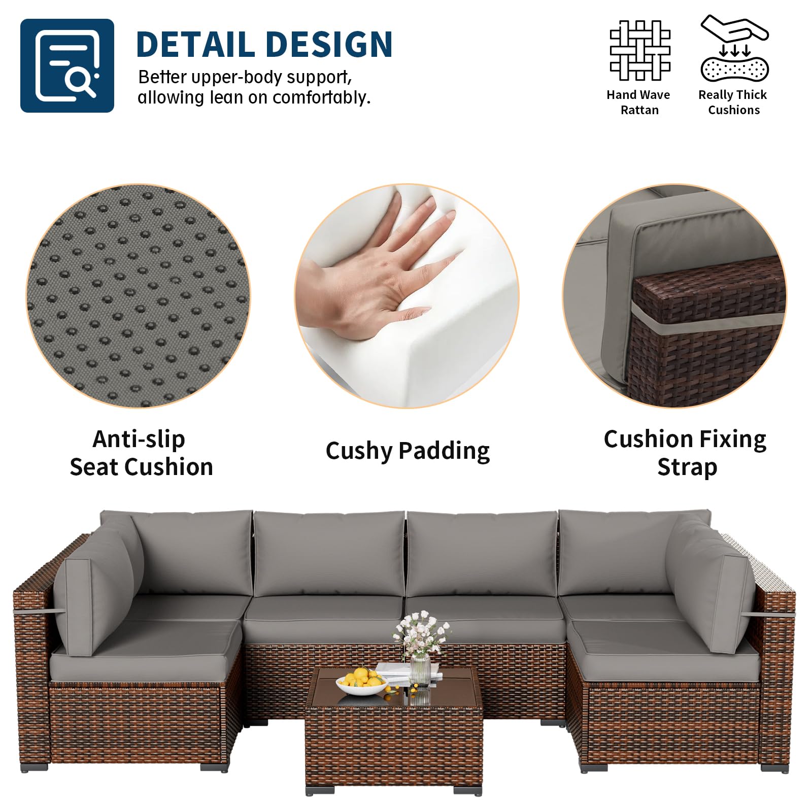 - Comfy Size Than Others: Our patio set offers a more comfortable experience with improved dimensions for easy knee bending and reliable back support. The seat height has been elevated to 17.5 inches, surpassing others at 14 inches. The included 4-inch thick cushions provide enhanced softness and support. Featuring silicone points under seat cushions and two fully encompassing fixing straps on the back cushions, you can bid farewell to the inconvenience of sliding discomfort.