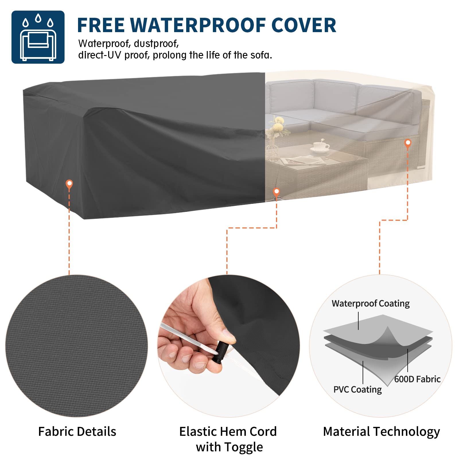- Includes Waterproof Cover: Our offering features 100% waterproof sofa cover. The outer layer is treated with a waterproof and water-repellent coating, the middle layer employs 600-density fabric, and the inner layer is coated with waterproof PVC. The cover, equipped with adjustable hem cords, undergoes a triple craftsmanship process, ensuring resilience against stains and harsh weather. This design promotes durability, keeping your sectional looking new for an extended period.