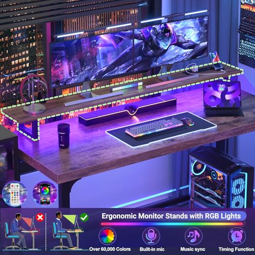 - Gaming Computer Desk with LED Light: The home office desk has a smart RGB LED light strip, provides over 60,000 colors & 29 flashing modes. The light has a built-in mic, music sync, and timer functions that can create a perfect ambiance that enhances your room. You can use smart remote control or APP to change the brightness and color easily.