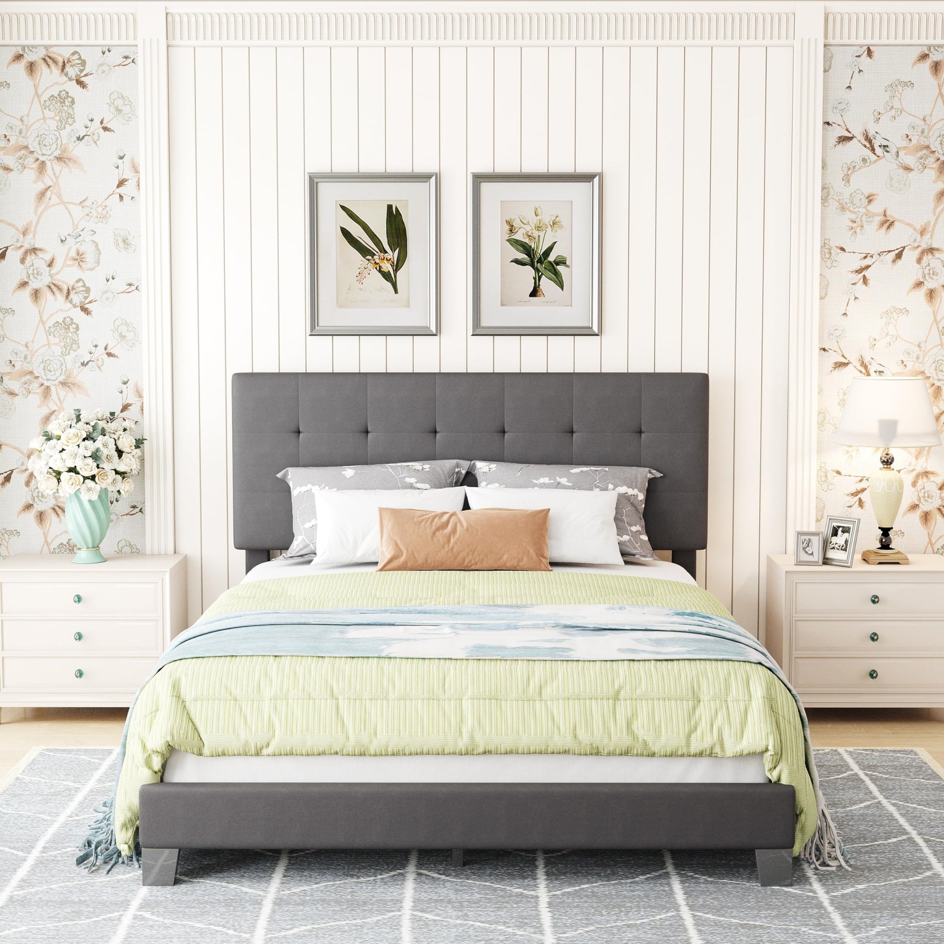 Upholstered Platform Bed with Tufted Headboard, Box Spring Needed Grey