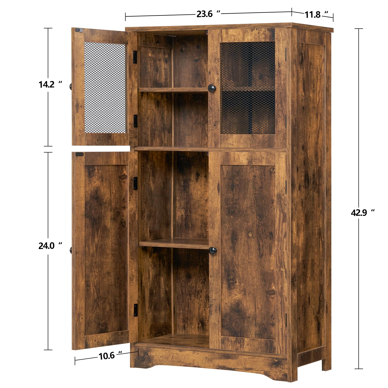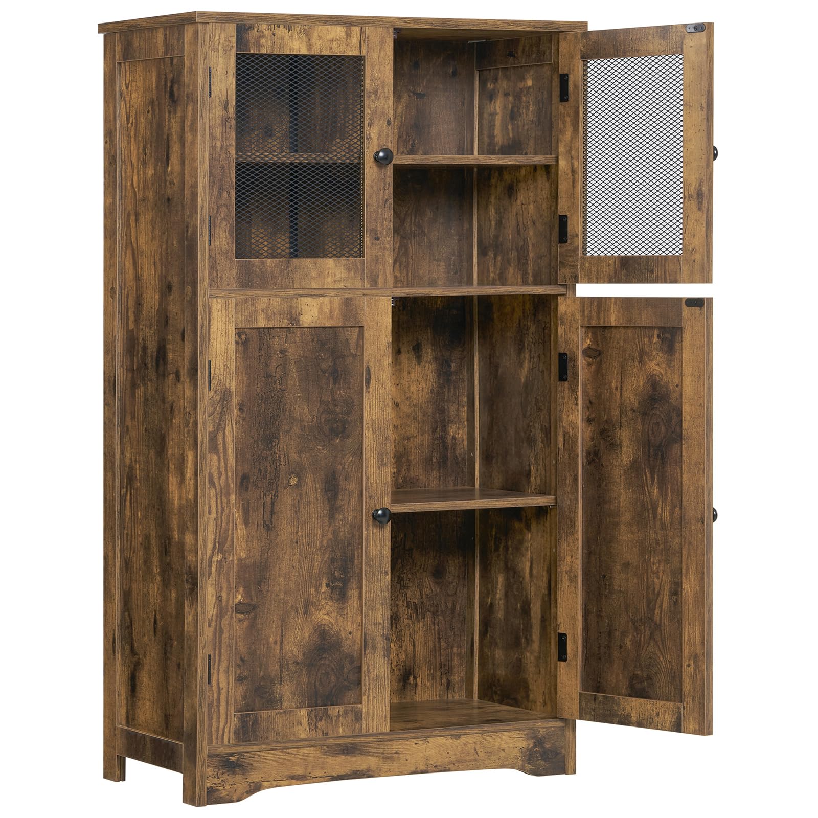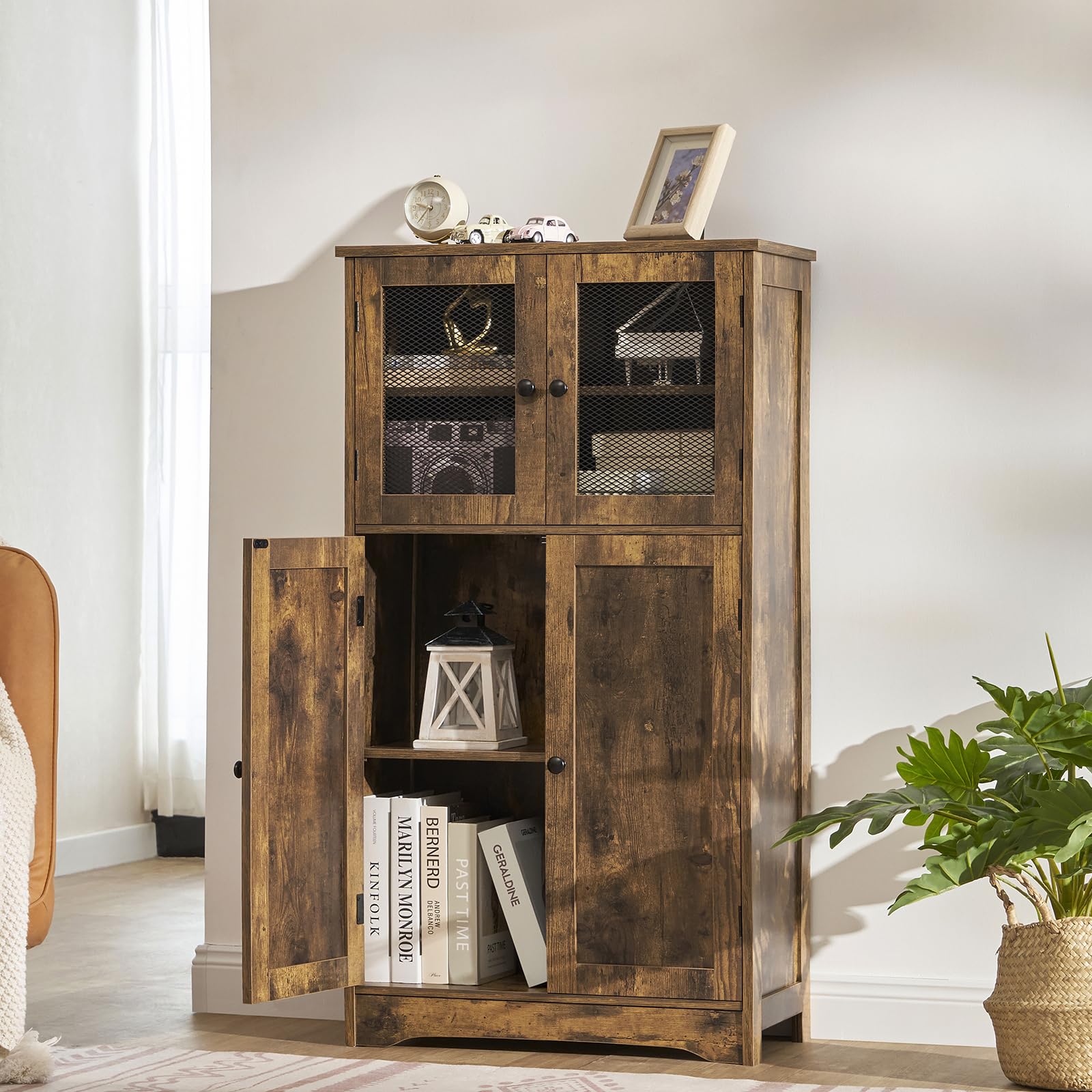 - USIKEY 4 doors large storage cabinet equipped with spacious space to provide enough storage for your items, such as books, bottles, tableware, CD, bathroom supplies, medicines and foods. 2 mesh doors on the top not only ensure ventilation, but also make it easy for you to quickly find what you want