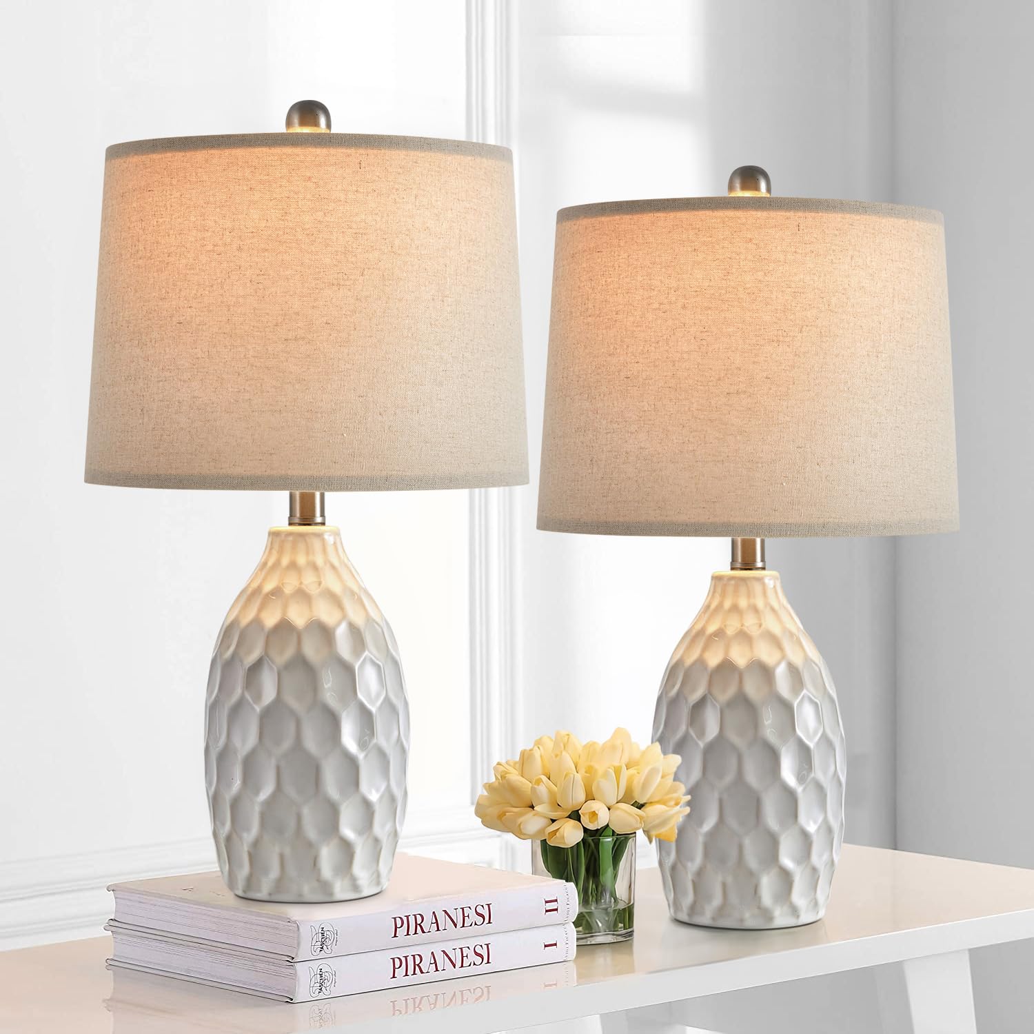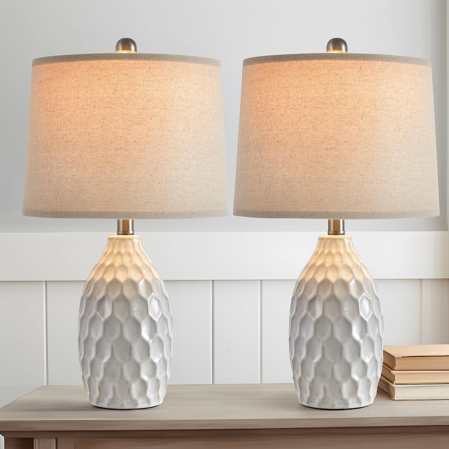 - Unique Styling: This white ceramic table lamp uses a 3-dimensional honeycomb pattern with a light-colored linen shade for any style of room
