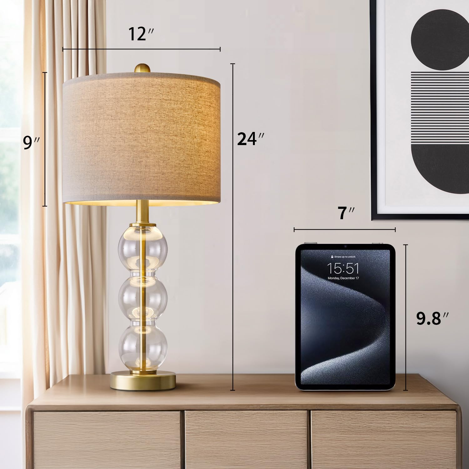 USumkky 24'' Glass Table Lamps Set of 2 for Bedroom Living Room,Gold Glass Bedside Lamps for Nightstands with USB Ports and AC Outlets(Bulbs not Included)