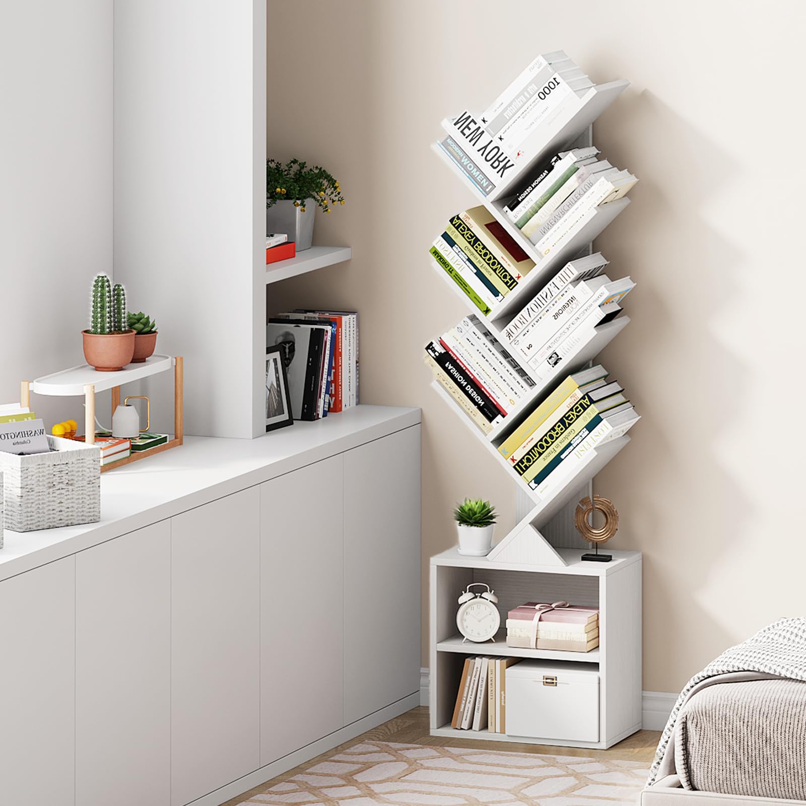 - The small tree book shelf is made of high-quality board material, which has a smooth and high gloss finish, tough texture, and a firm structure. Our tree geometric space saving bookcase with a sturdy base and reliable backboard offers robust stability and has a strong load-bearing capacity. For added stability and safety, we offer anti-tip kits to secure the bookshelf to the wall and prevent the shelf from dumping, especially for families with children and pets.