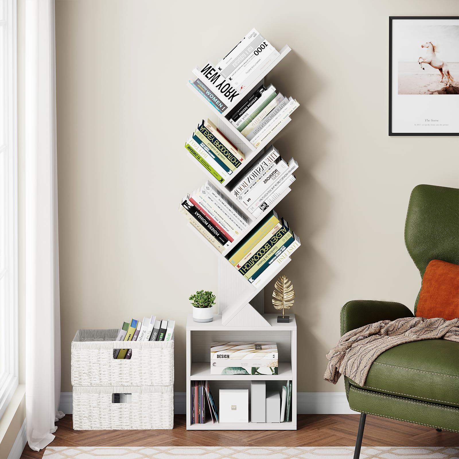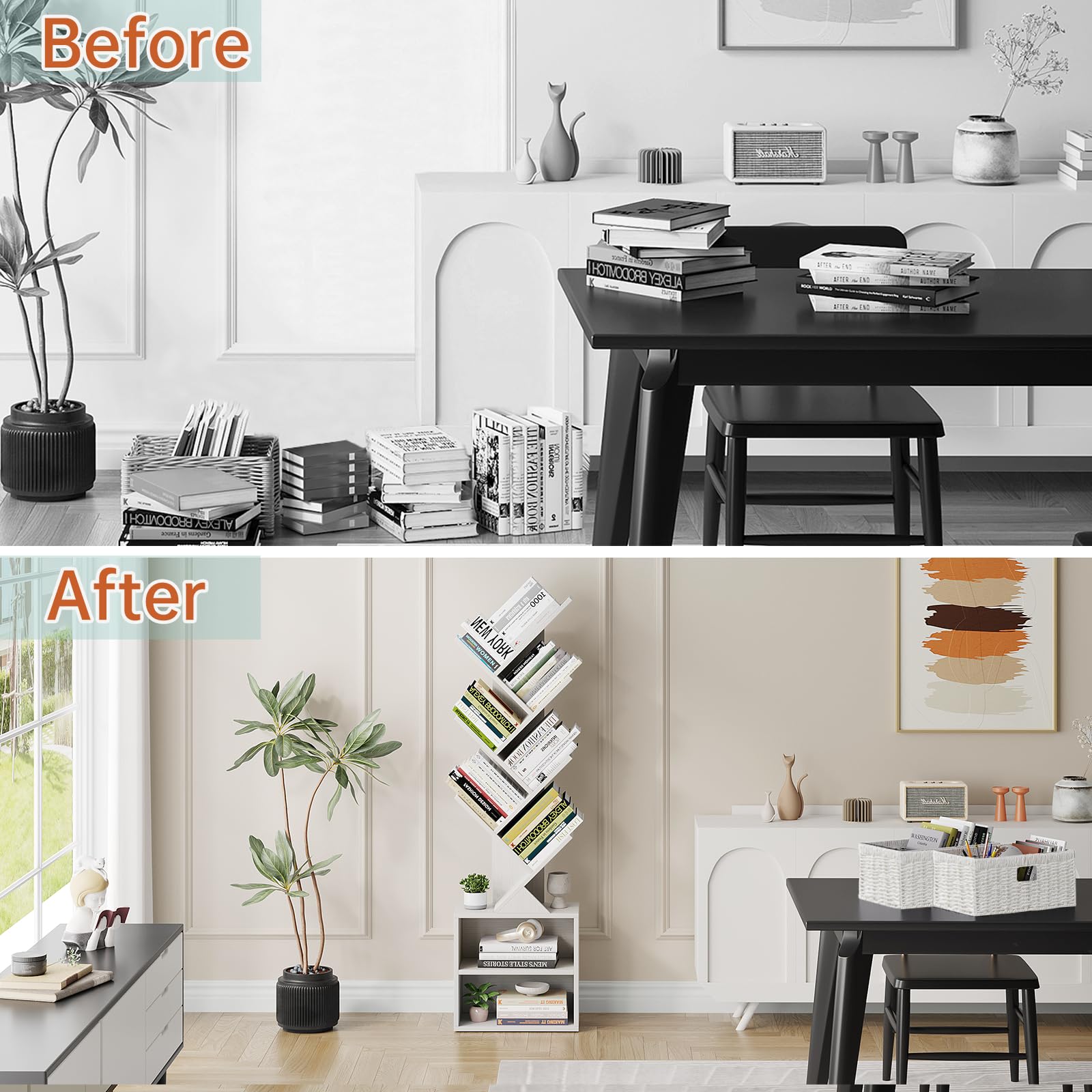 - The tree bookshelf combine modern design with vintage timeless colors. Inspired by nature, the bookshelf is finished with a tree-branch structure, and it presents a unique elegance with a warm atmosphere. Whether placed in the living room, bedroom, bookroom, or home office, office furniture for small spaces, this small bookcase can blend in with most home decor styles and brings a touch of sophistication and uniqueness to any space.