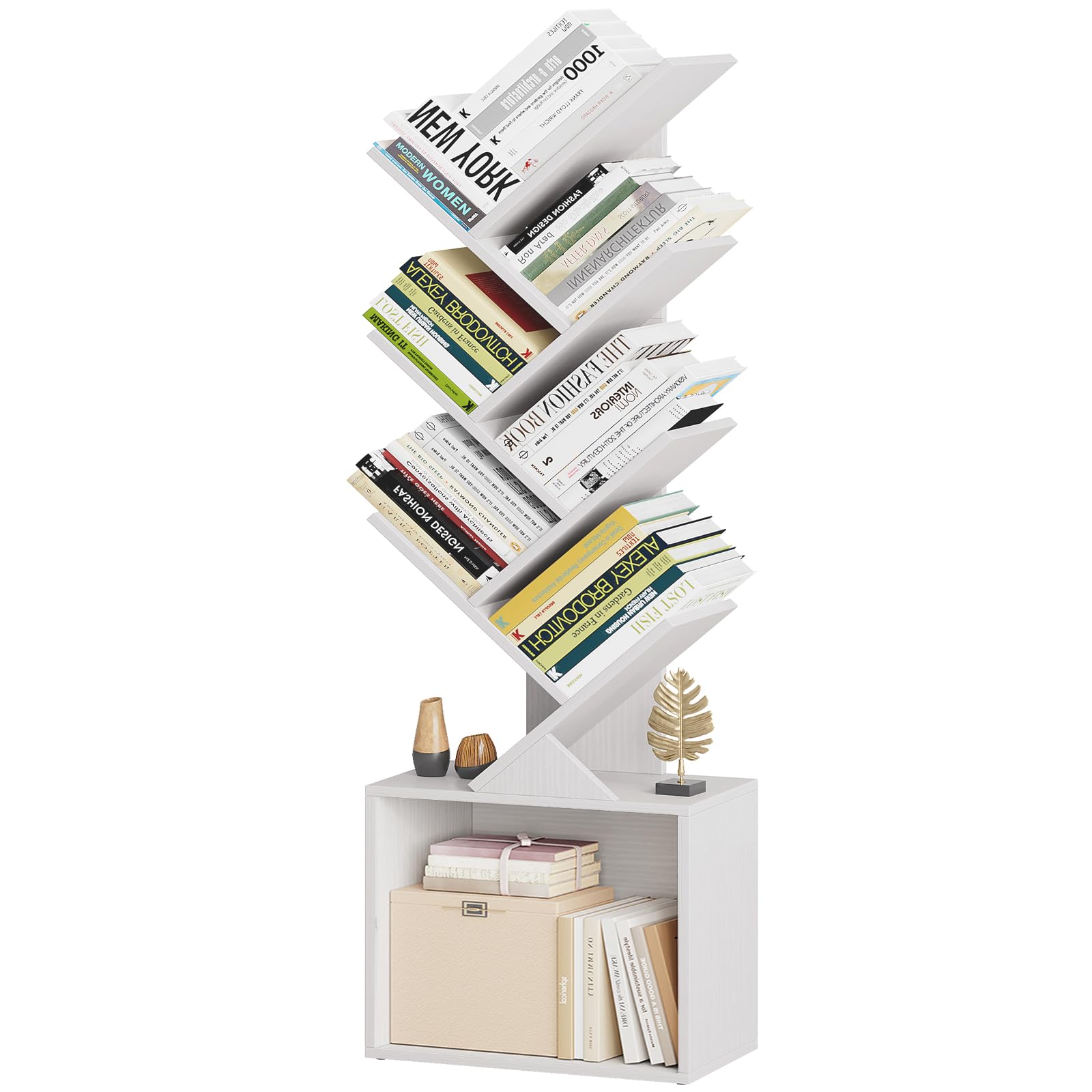 6 Tier Tree Bookshelf, Modern Floor Standing Bookcase with Storage Drawer, Space Saving Storage Organizer Book Shelves for Books, Tall Wood Storage Rack for Bedroom/Living Room/Home Office