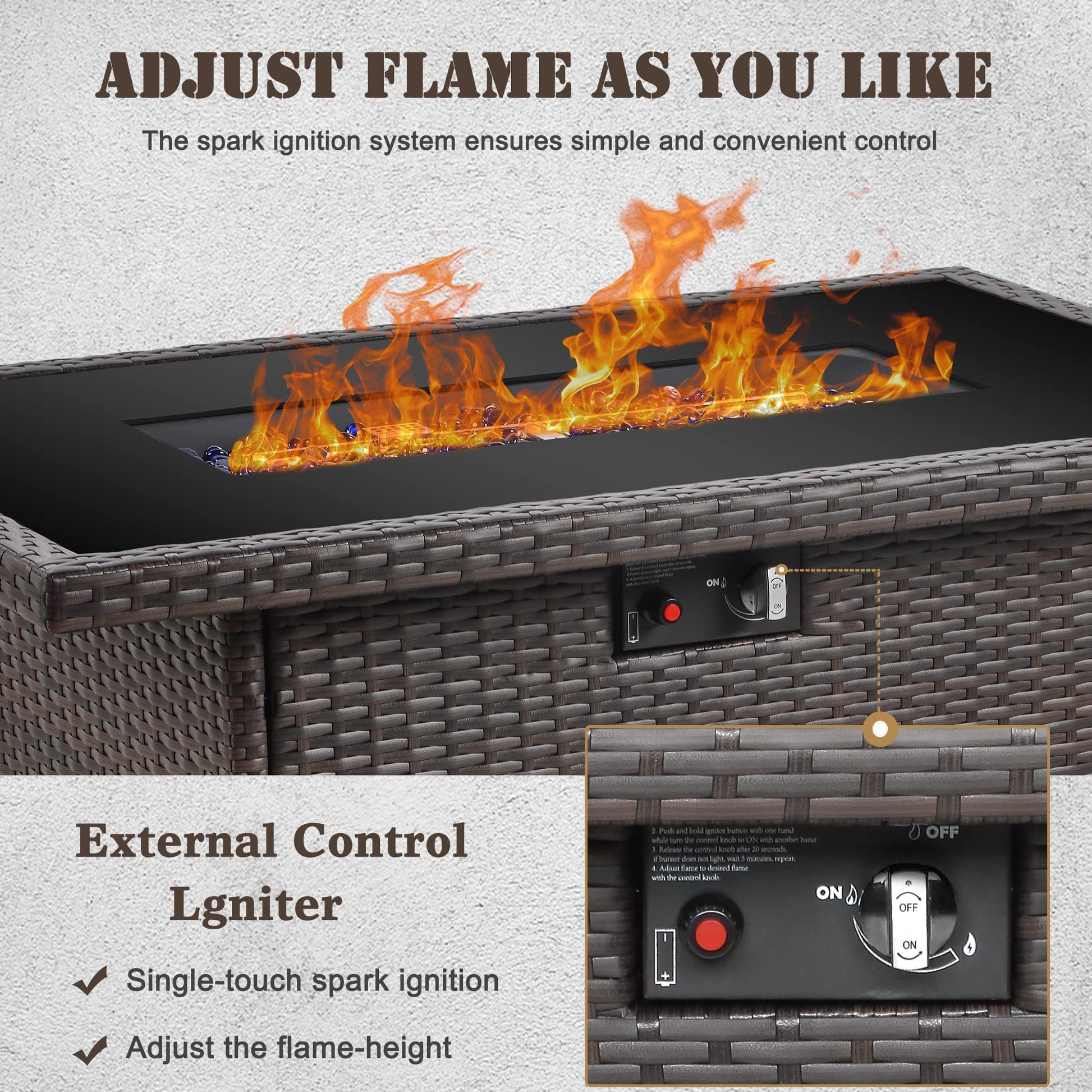 - SAFETY ECO-FRIENDLY - The 55000 BTU outdoor firepit table with CSA certification.Upgraded dual-tube burner to provide more stable and cleaner combustion.The button automatic ignition design can adjust and control the flame level, which is safer and more convenient.