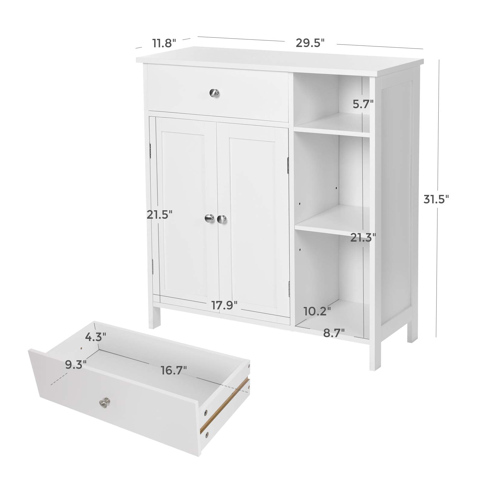 - Durability Matters Made from sturdy P2 grade engineered wood, this freestanding cabinet with a smooth, eas yto clean, white finish and 3 silver metal knob are built to withstand everyday use