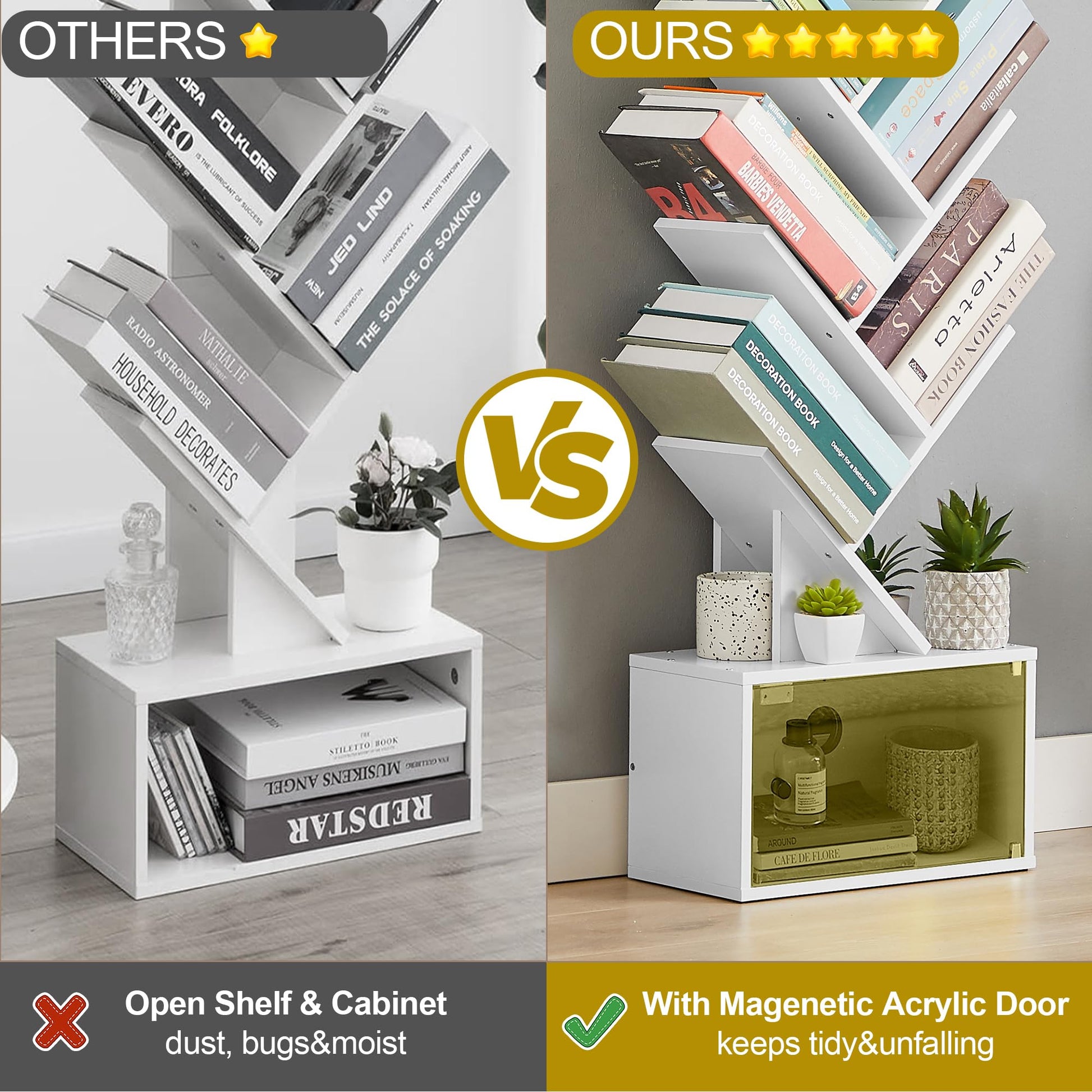 - Not only does this tree book shelf provides great stability and durability, because there is a small storage cabinet at the bottom,to secure the bookshelf floorstanding, which greatly improves the safety and stability of the bookshelf and for storage meanwhile.