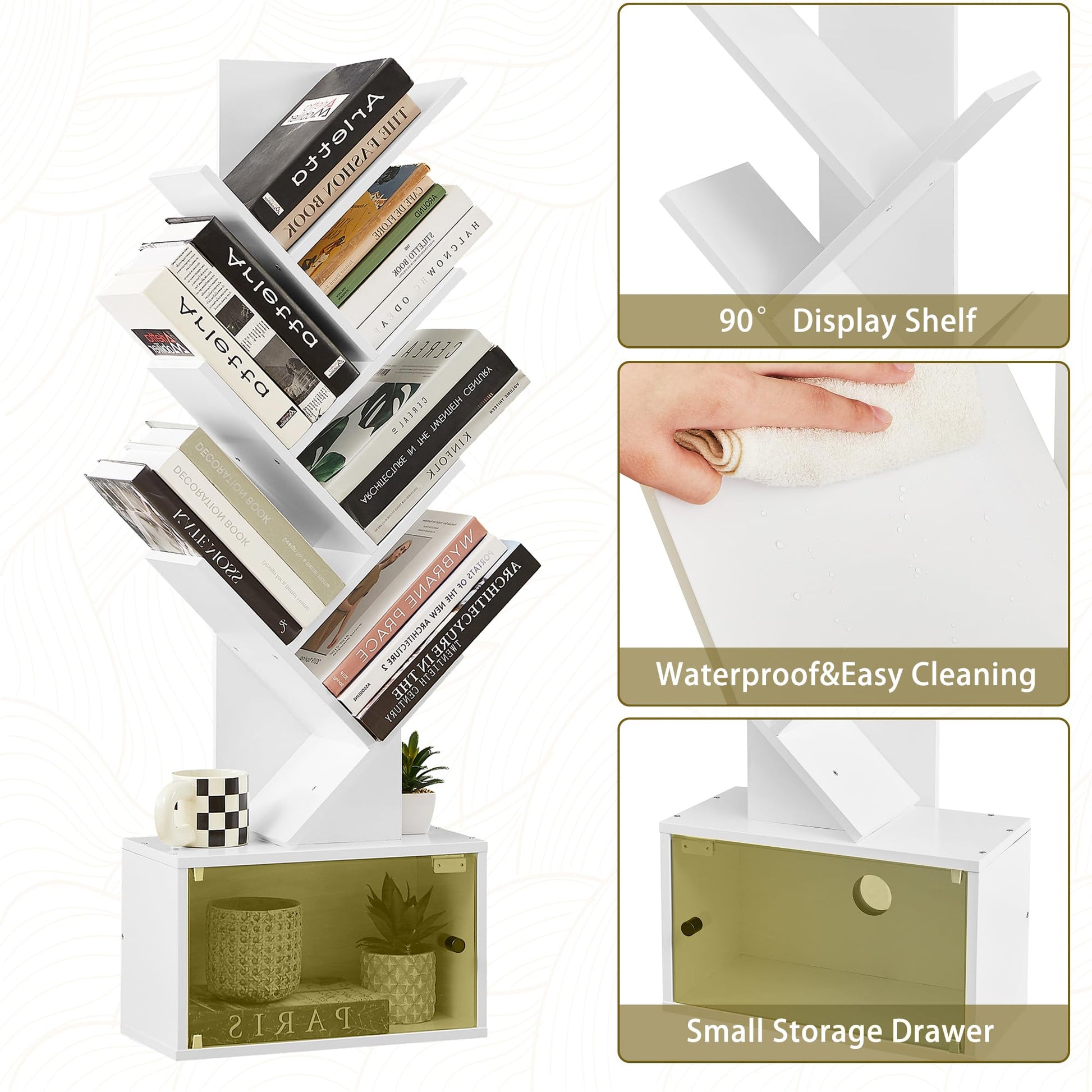7-Tier Tree Bookshelf with Drawer, Wooden Tree-Shaped Book Display Shelves for CDs/Magazines/Books, FreeStanding Geometric Bookcase Organizers for Home Office, Ivory White