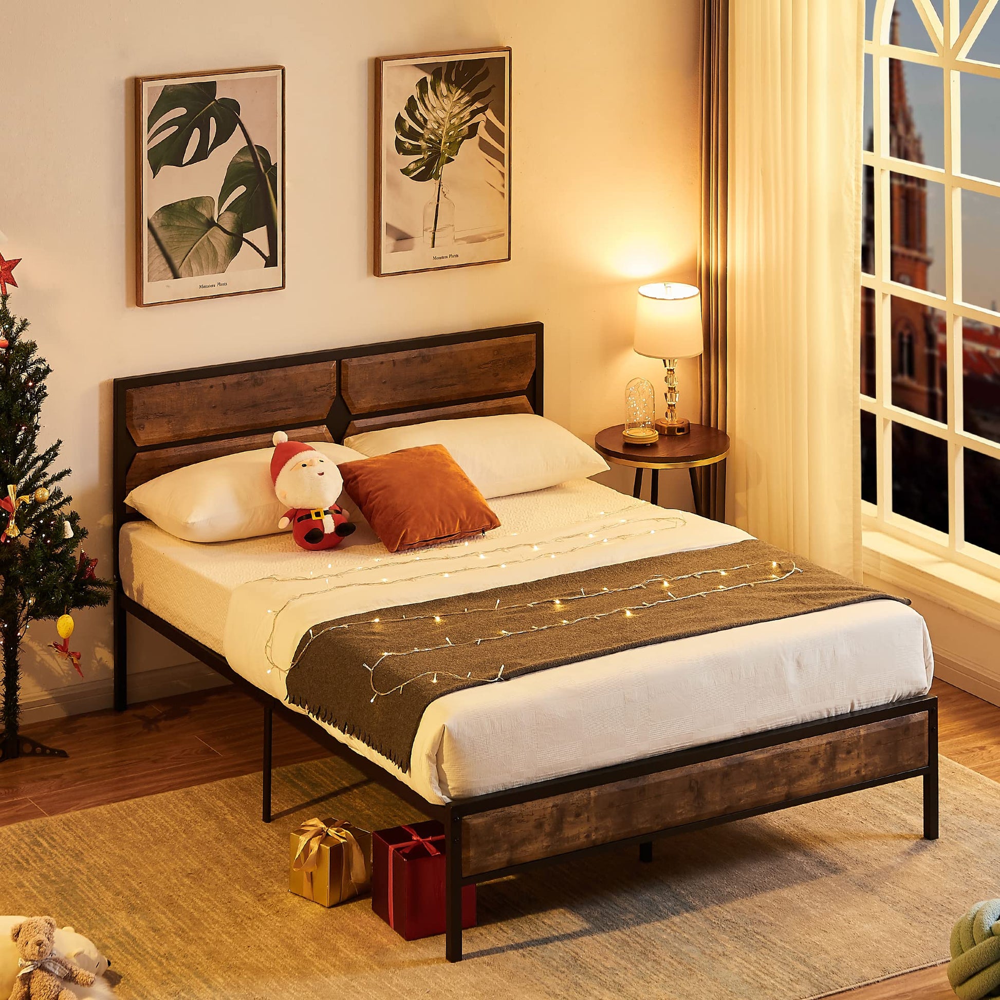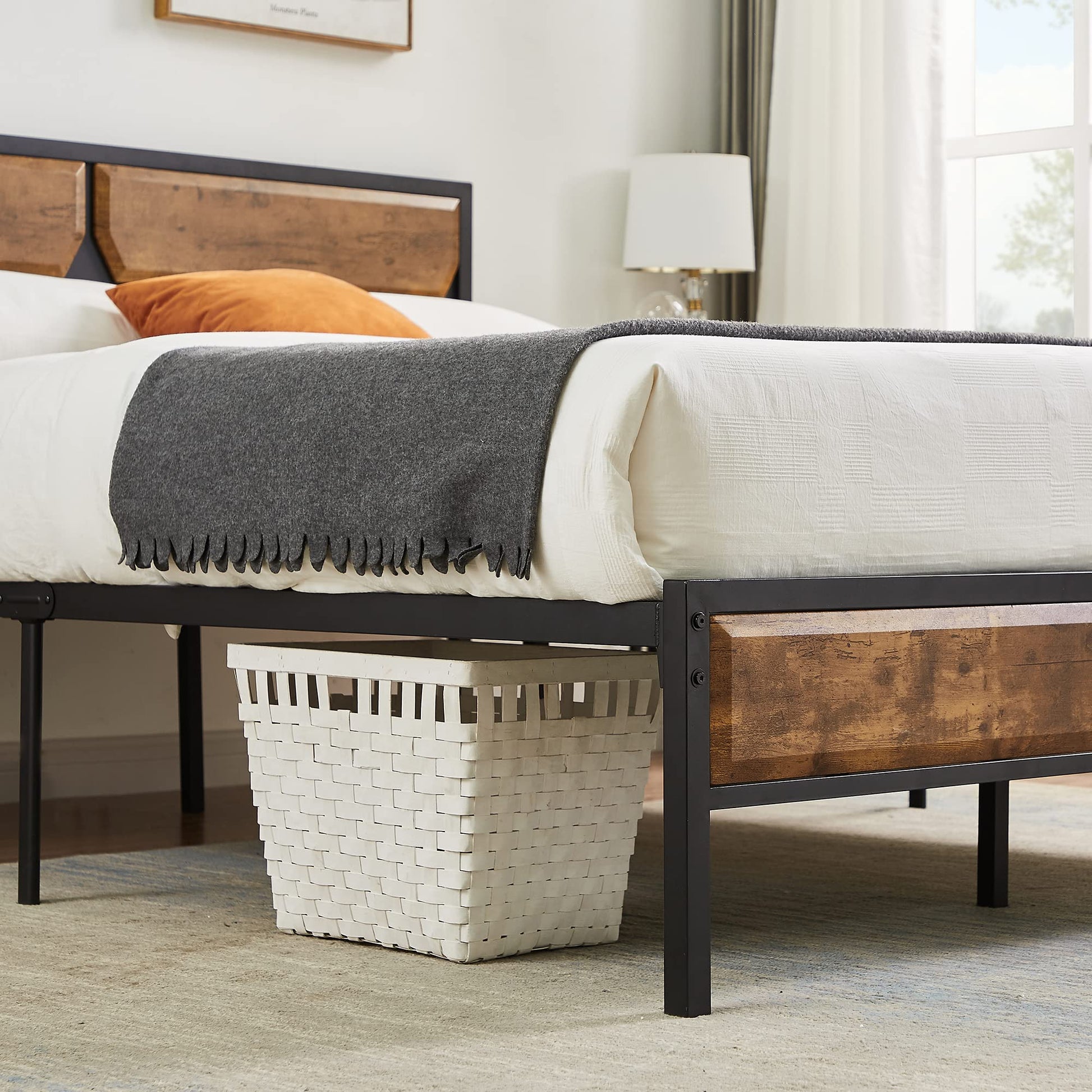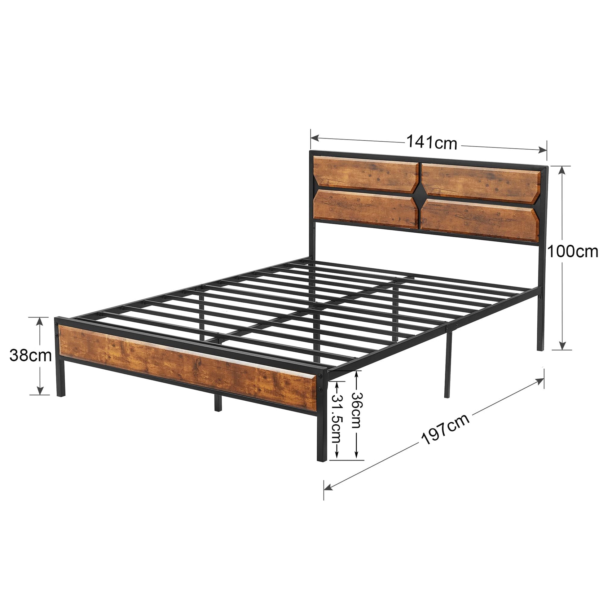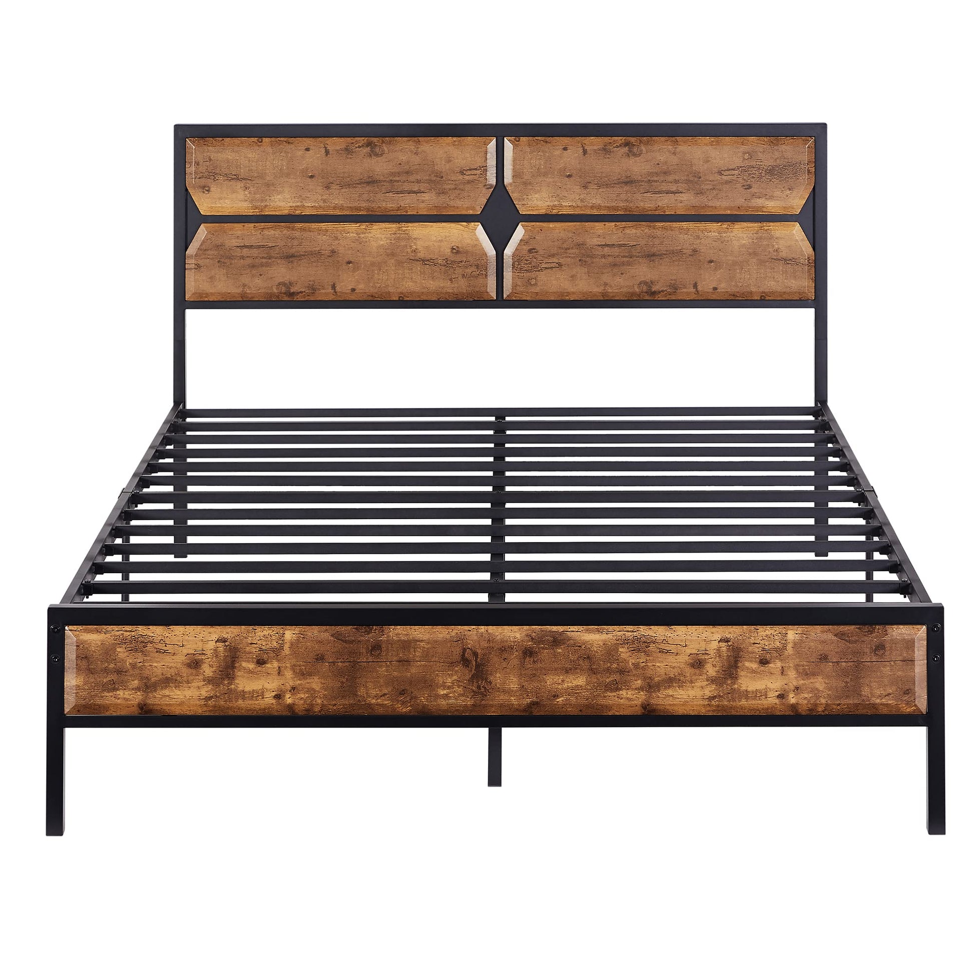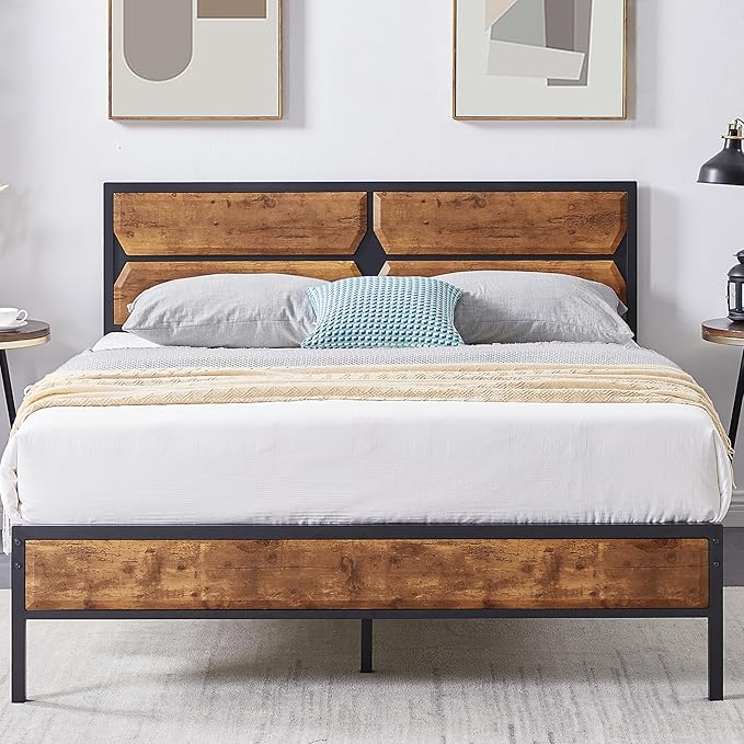 - This full bed frame has a wooden grain headboard and footboard in rustic industrial style. The linear three-dimensional patchwork design of Craft adds an elegant element to your life. Ideal for the living room, dormitory, guest and so on. With the 12.3" under bed height frame, you can have more space to store what you want.