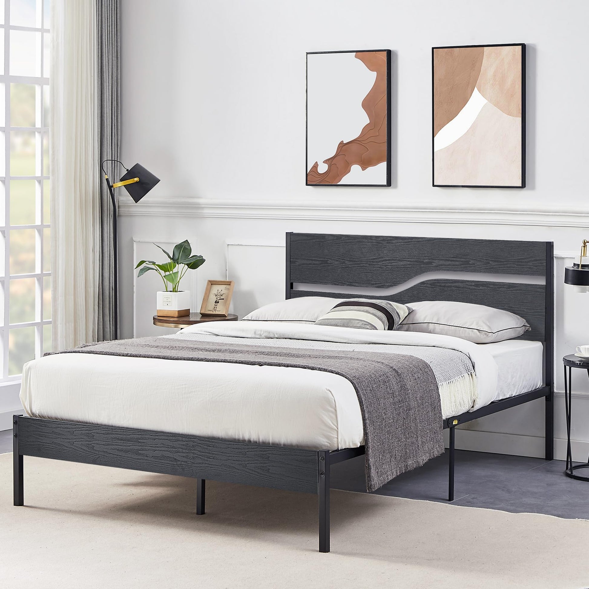 Full Size Platform Bed Frame with Wood Headboard, Strong Metal Slats Support Mattress