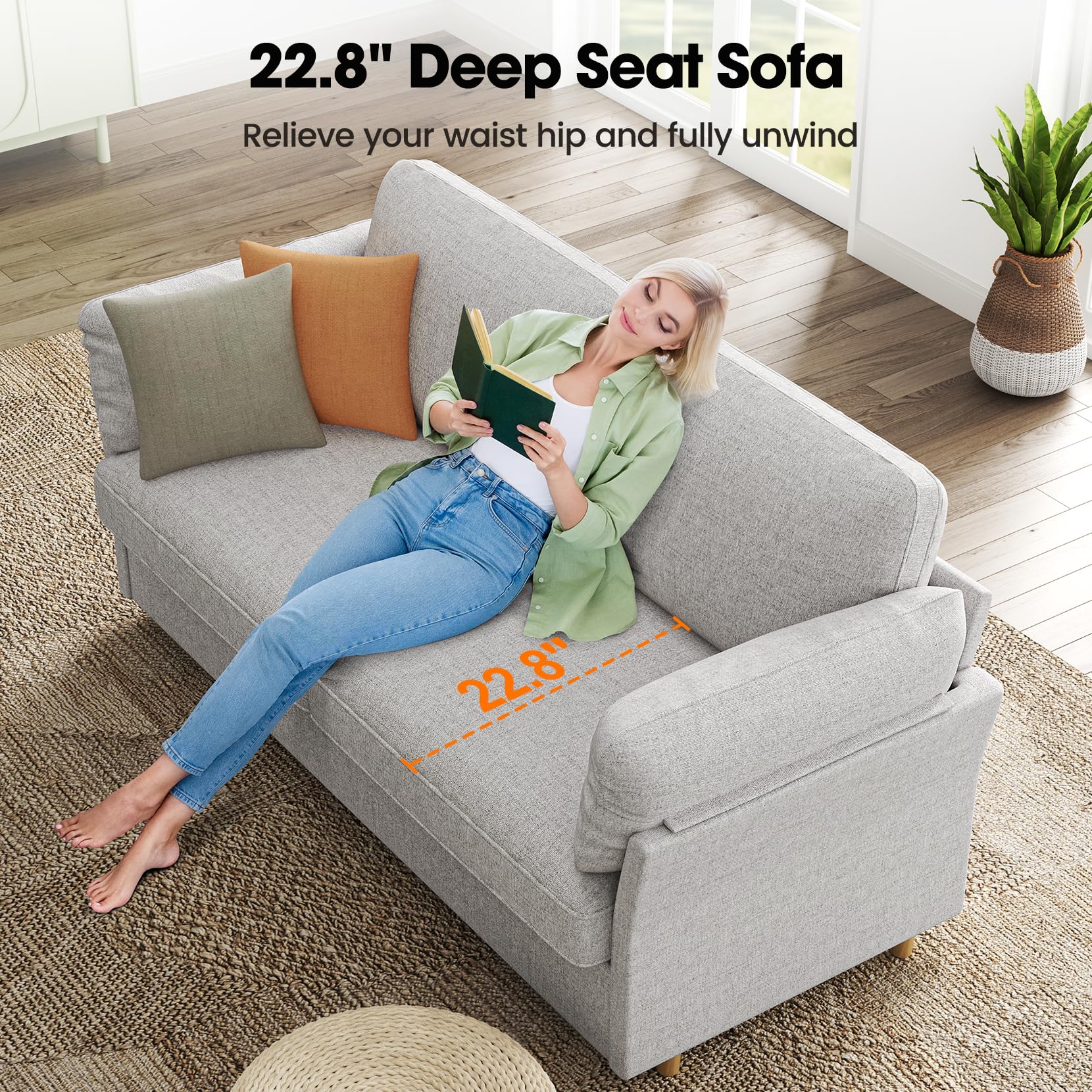 - 22.8" Deep Seat Comfy Sofa- Featuring a 22.8" deep seat with high resilient foam, the loveseat will always bring you a soft and comfortable feeling! This deep seat sofa can meet all your needs, no matter what you want, sit, lounge, sleep or even sit cross-legged on it. The comfy sofa can let you indulge in the ultimate comfort! Just enjoy your leisure time, watch tv, chat, and play games in complete relaxation on it.