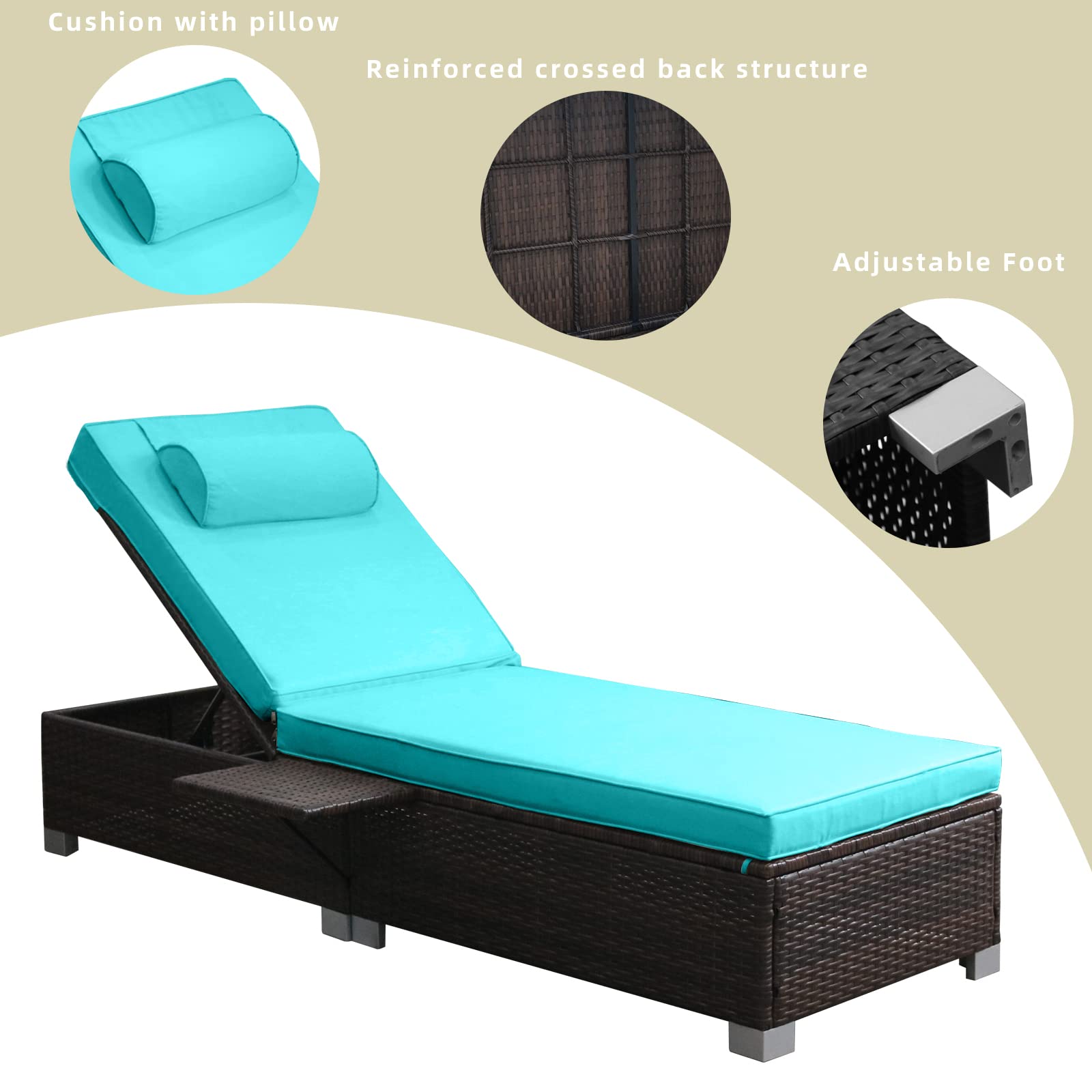 - Patio Chaise Lounge Set Unique Design Outdoor reclining chair set includes 2 x Chair, 2 x Side Shelf, 4 x Seat Cushion. The back of this recliner has 5 reclining positions,you can adjust back of a chair according to your need, enjoy the comfort of different angle. The cushion comes with pillows for extra comfort. There is a shelving board on the right side of the lounge chair, allows you to place drinks, eats, coffee, or any other items.