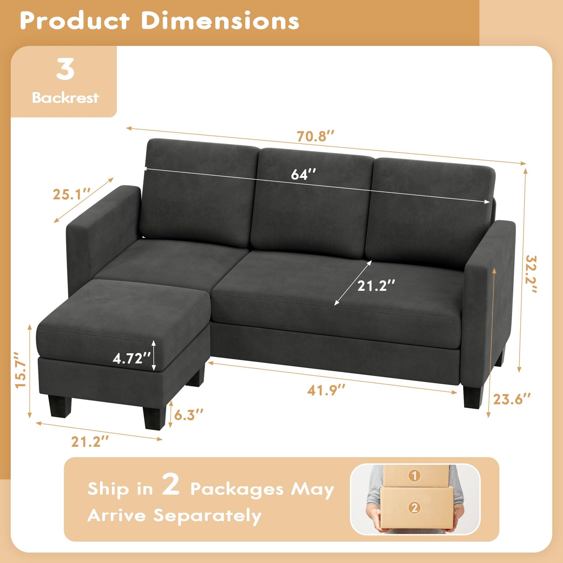 Convertible Sectional Sofa Couch, 3 Seat L-Shaped Sofa with Linen Fabri