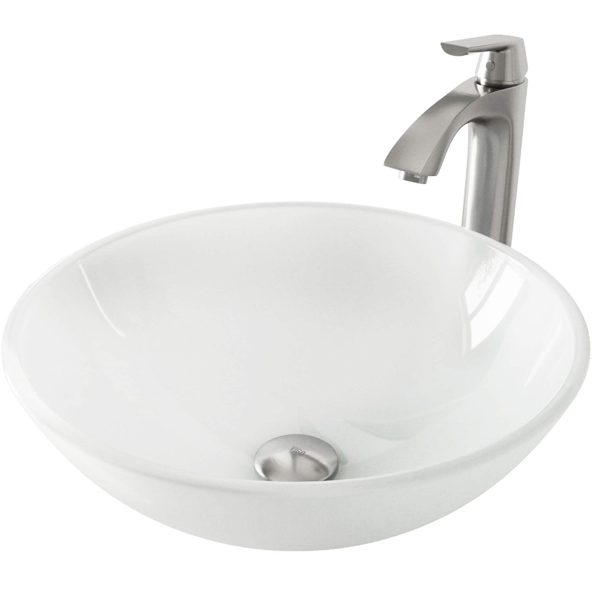 VIGO 17" L -17" W -12" H White Frost Glass Round Vessel Sink Set with Faucet and Drain