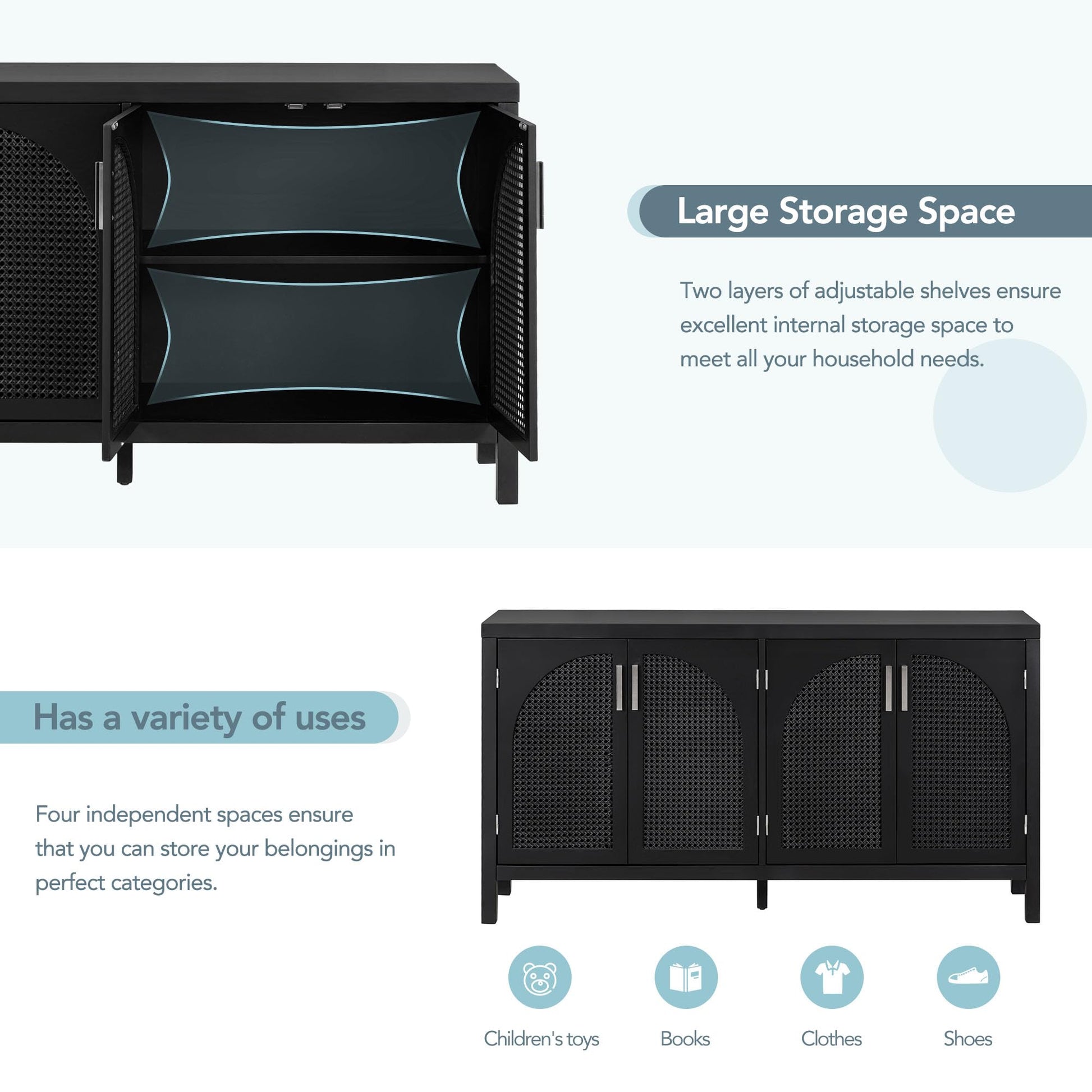 - Simple Style Sideboard 4-door cabinet with special-shape artificial rattan door panels, convenient metal handles, and straight-line frame can be placed in your living room, study, and other places, making it an ideal choice for any room in your home. The details of the whole cabinet show the simplicity and generosity of the cabinet everywhere, and the classic cabinet is easy to match with your home style and won't be abrupt.