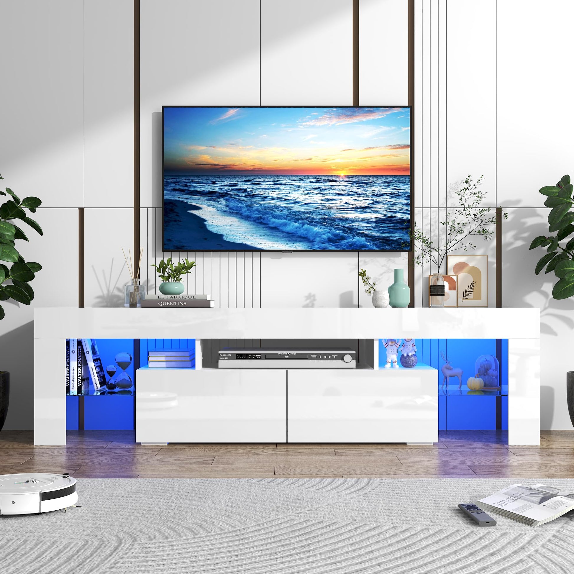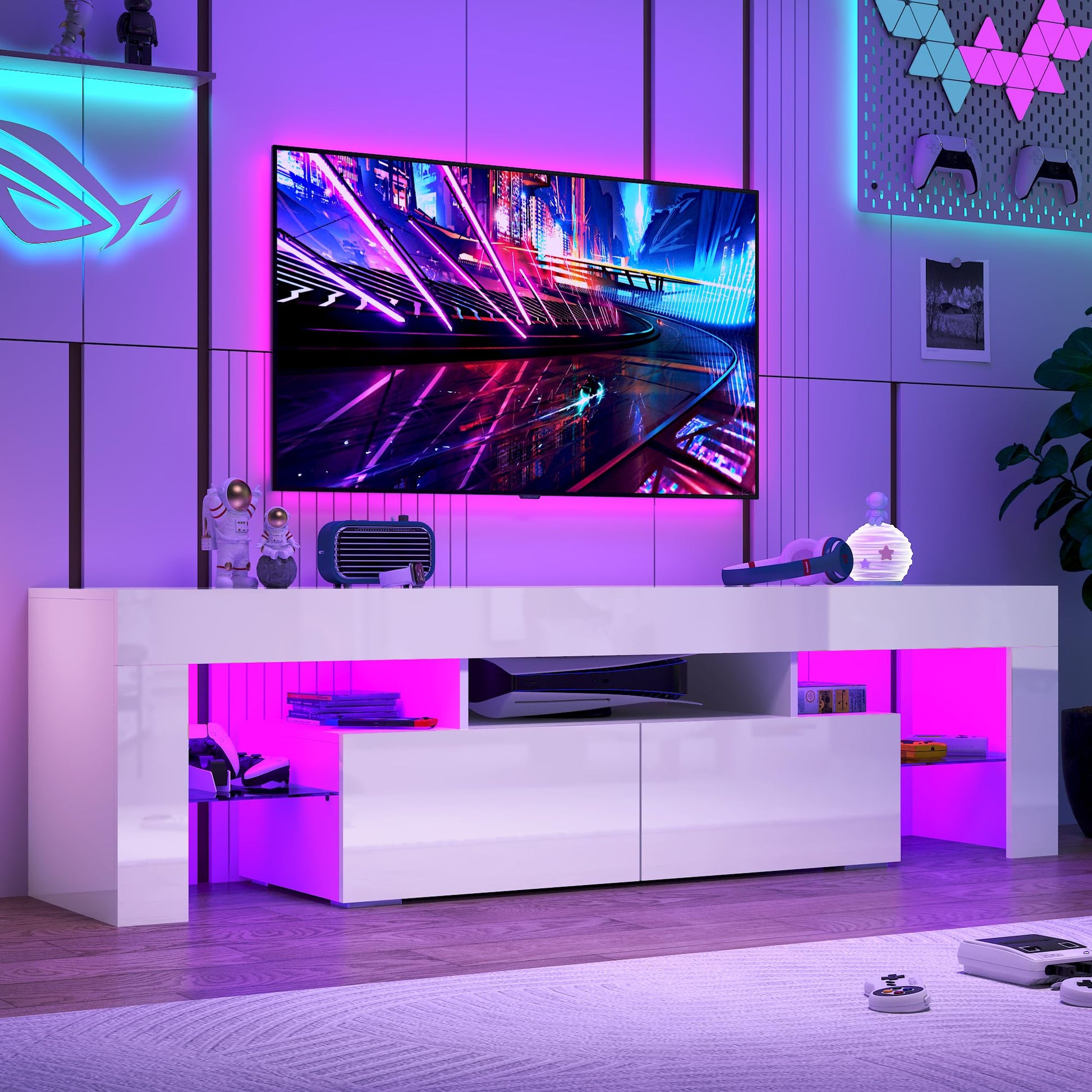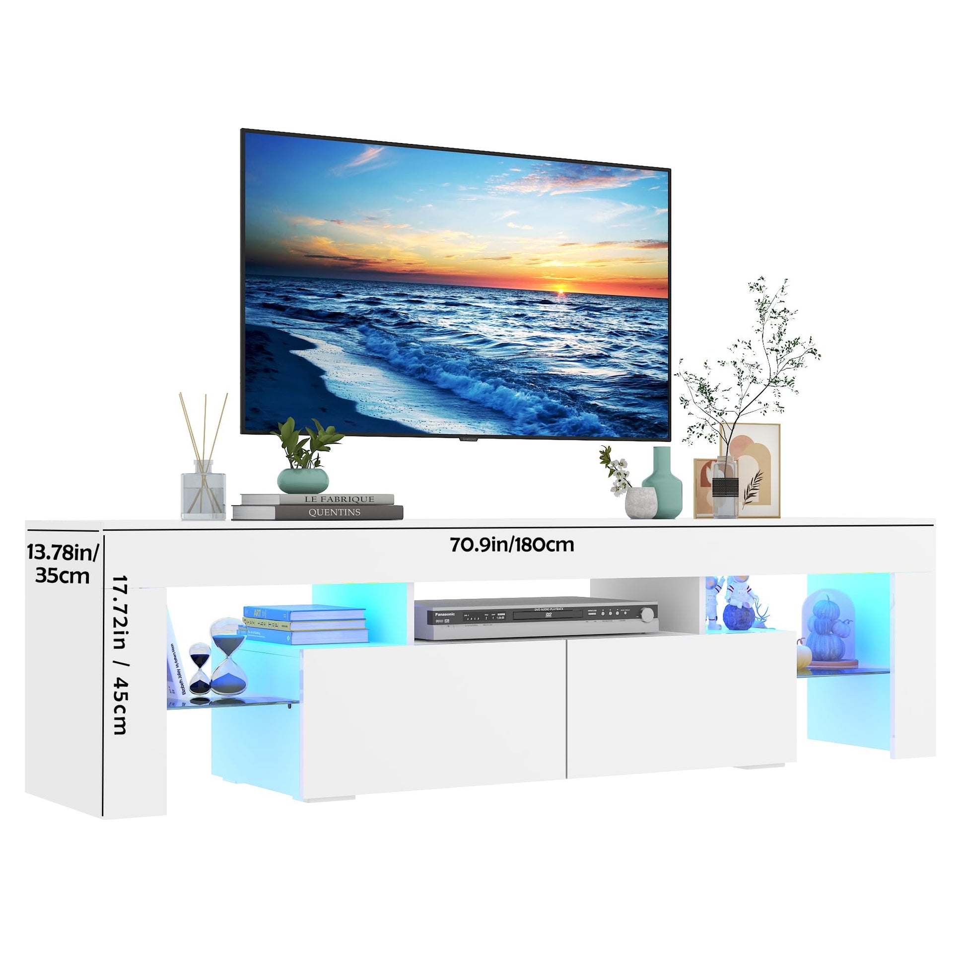 - MODERN Style TV STAND The LED entertainment center available in blackand white ,The modern TV stand for 65 inch TV is big enough to support 50”, 55” 65”, and even 70” TVs in plasma, LED, OLED, and LCD options, which makes it the perfect choice for modern homes.Simple geometric lines and open shelving capture the minimalist feel of a contemporary space.