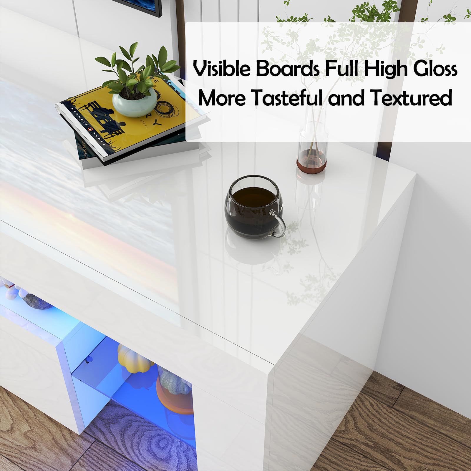 - MODERN DESIGE The TV stand glossy black product has full high-gloss visible on the whole surface, not just the front high-gloss, it is relatively high-end. High-hardness MDF board + tempered glass, using a smooth paint process, while ensuring firmness and permeability, it is very beautiful and practical.