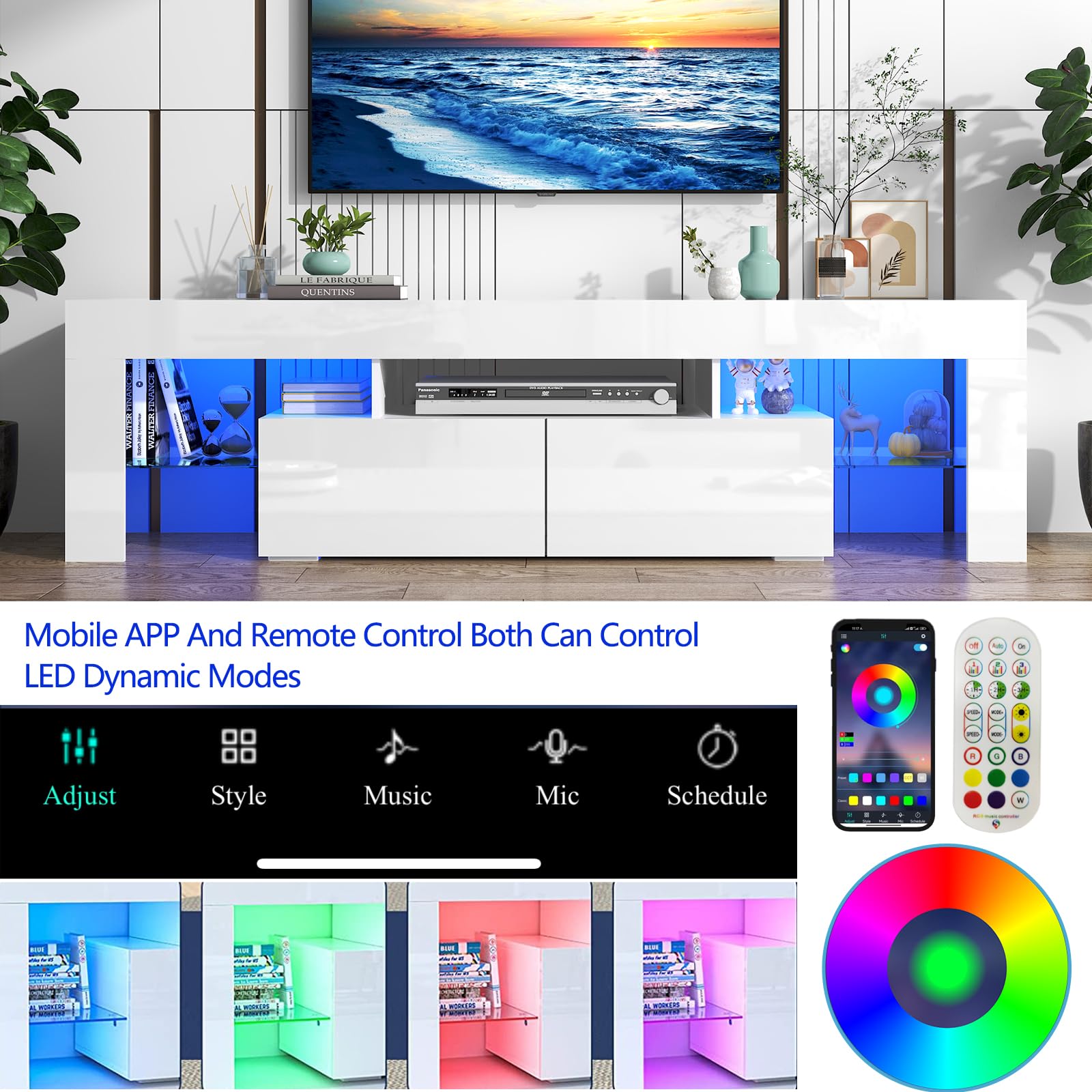 - SMART DIY RGB LED SYSTEM The black entertainment center equipped with 24-key remote control, you can enjoy 16 colors of RGB lights and 4 change modes. This RGB Modern LED light entertainment center is equipped with RGB LED lights. The light sequence can be set by DIY, and the LED system with memory function allows you to save your favorite dazzling colors.