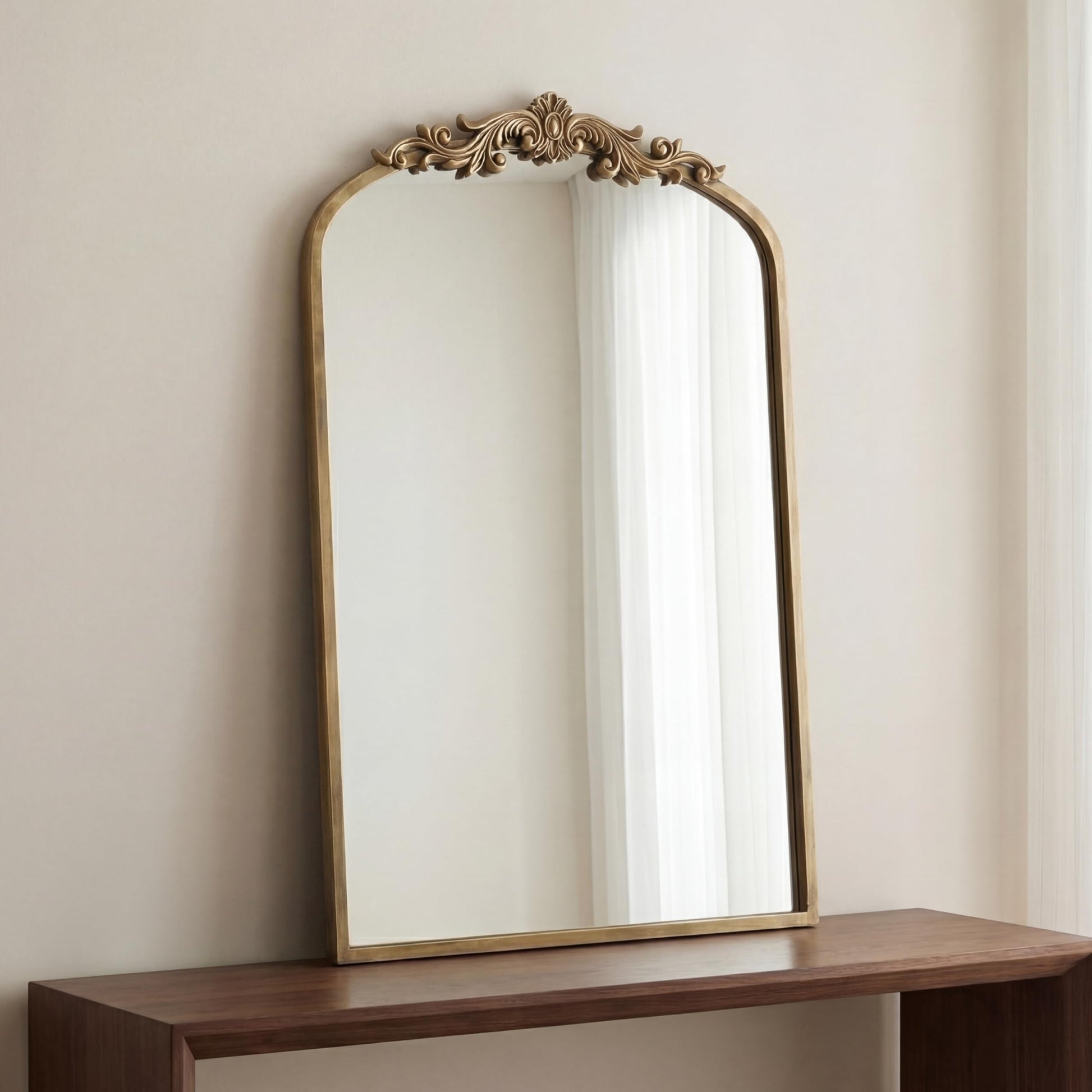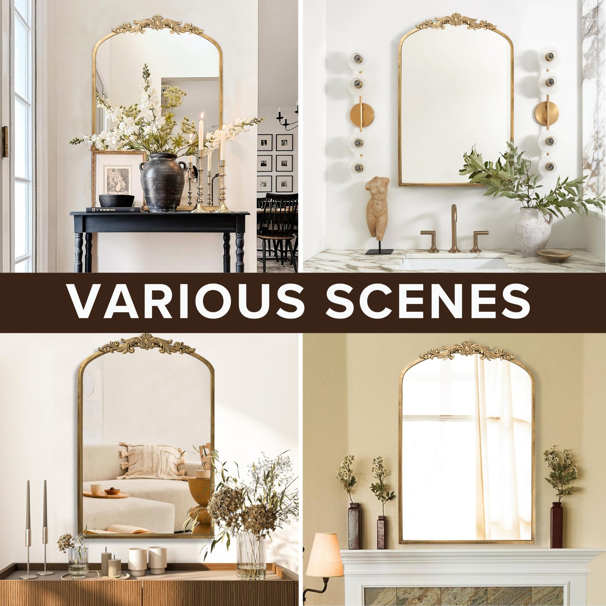 Transform your space with this stunning vintage-inspired arched baroque mirror, featuring an ornate gold finish that brings timeless elegance to any room. The antique design showcases intricate detailing reminiscent of classic European craftsmanship, making it a sophisticated focal point for your bathroom, living room, fireplace mantel, entryway, or hallway.