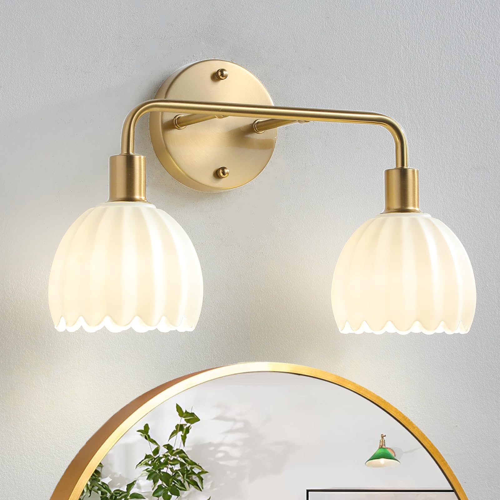 - This bathroom vanity is made of solid gold brass metal and thick milk white glass floral lampshade. The light is soft and comfortable, the shape is simple and elegant, it is a good choice for bathroom decoration and lighting.