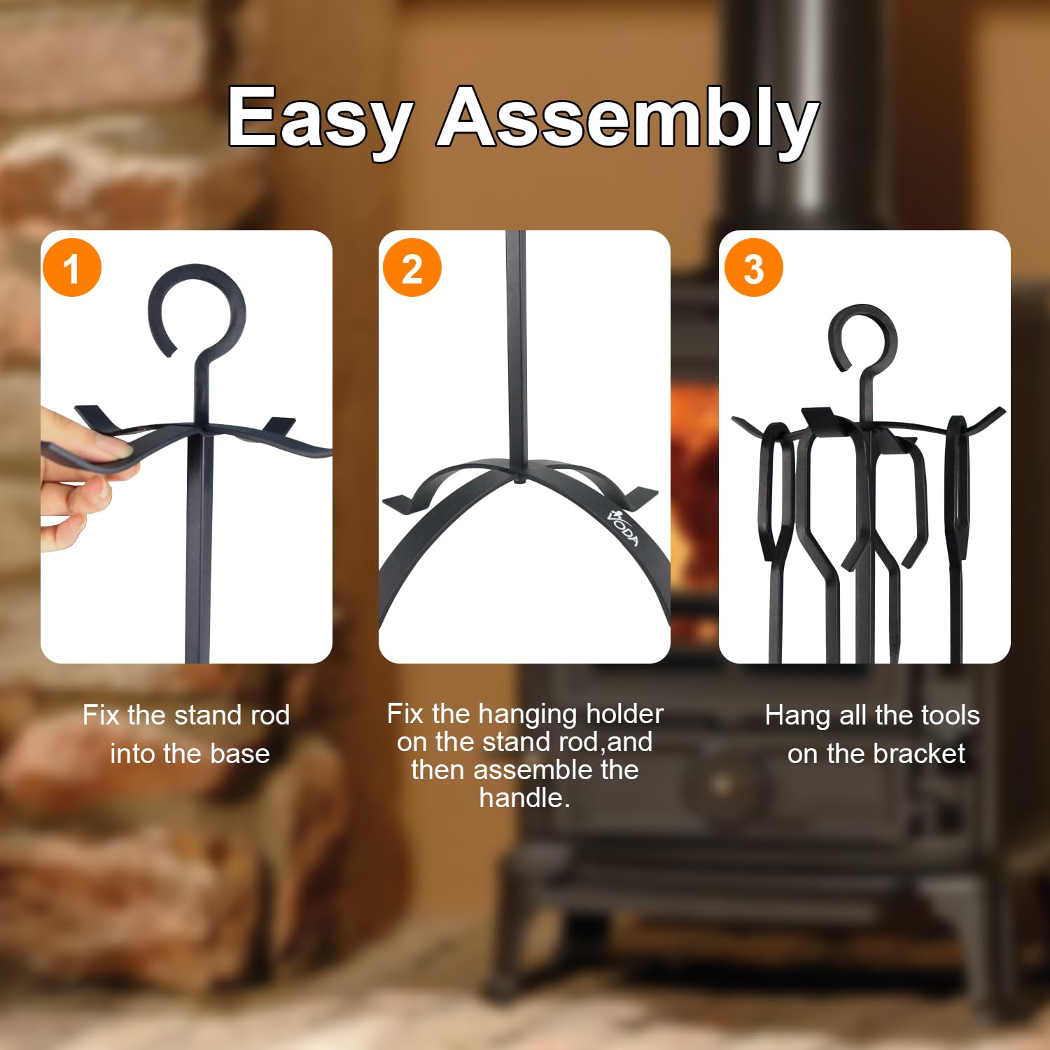 - Easy to Assemble:The assembly is pretty simple, you only need fix the stand rod into the base firstly and then fix the hanging holder on the stand rod and assemble the handle. The top support of tools keeps your firepit tools neatly organized, and the heavy base make it more sturdy. Ease of use fireplace tools work perfectly for your fireplace, matching with both wood-burning and gas chimney.