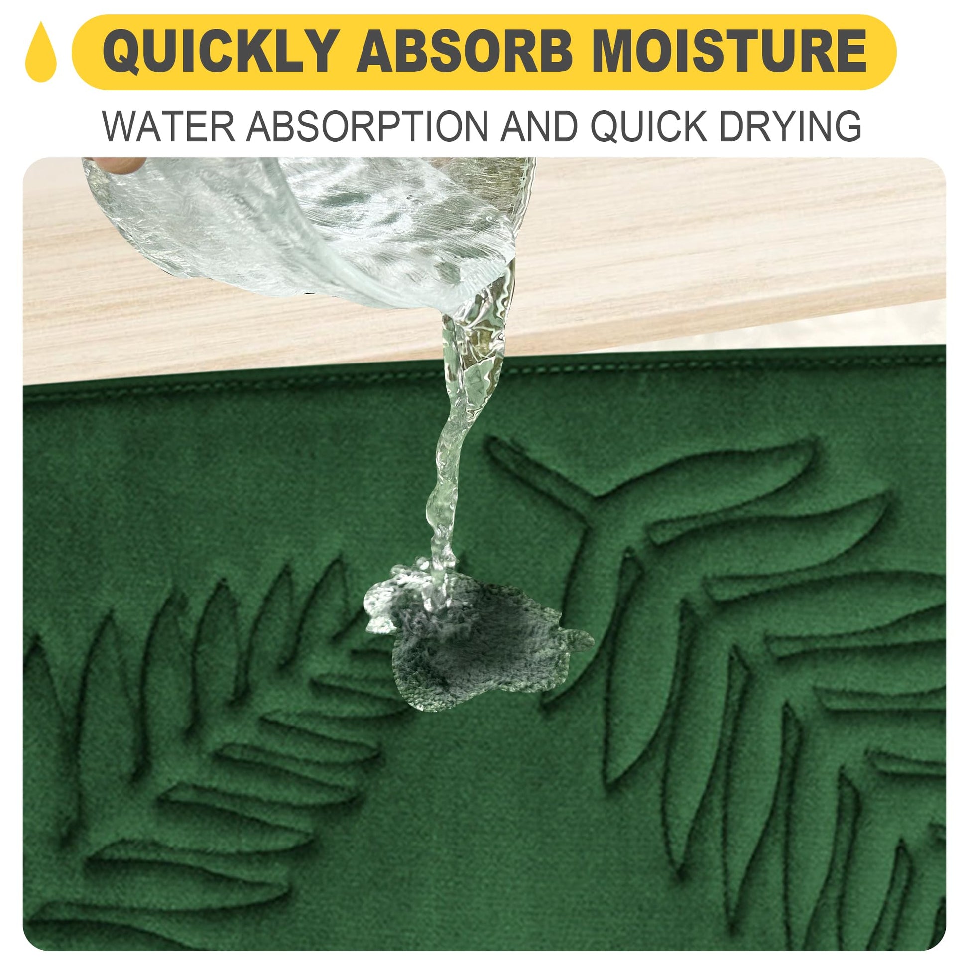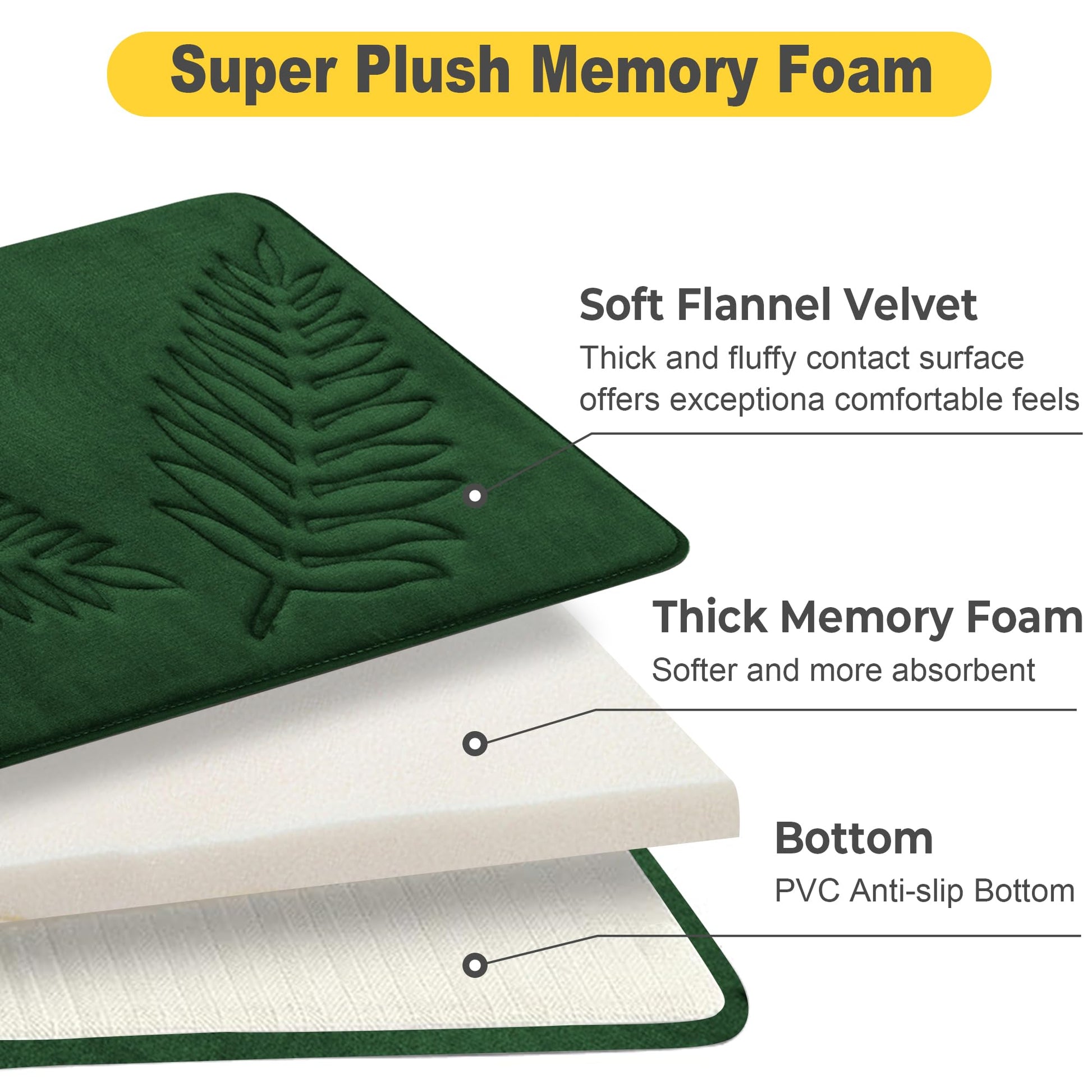 - Non-slip Back: The back of the washable memory foam bathroom rugs has a non-slip PVC mesh that prevents shifting and slipping, protecting you and your family from slipping in the bathroom. Place the green velvet bath mat on a clean and dry floor. Please make sure the bottom of the dark green bathroom rugs is dry and clean.