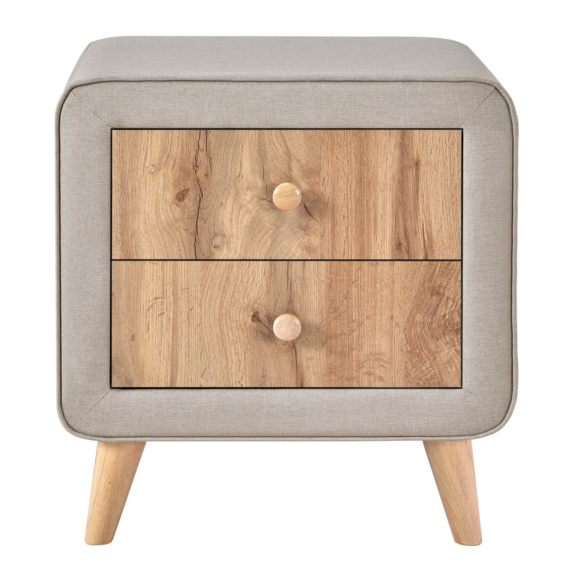 - This bedside table is constructed of wood and linen, the leg and the handles are made of rubber wood.This nightstand is very sturdy and reliable. It can be used for a long time.