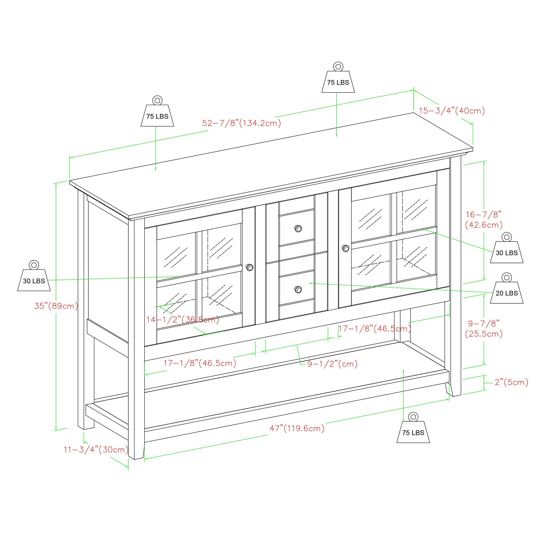 - Dimensions: 35” H x 15.75” D x 53” L, Bottom shelf: 2” H x 11.75” D x 47” L