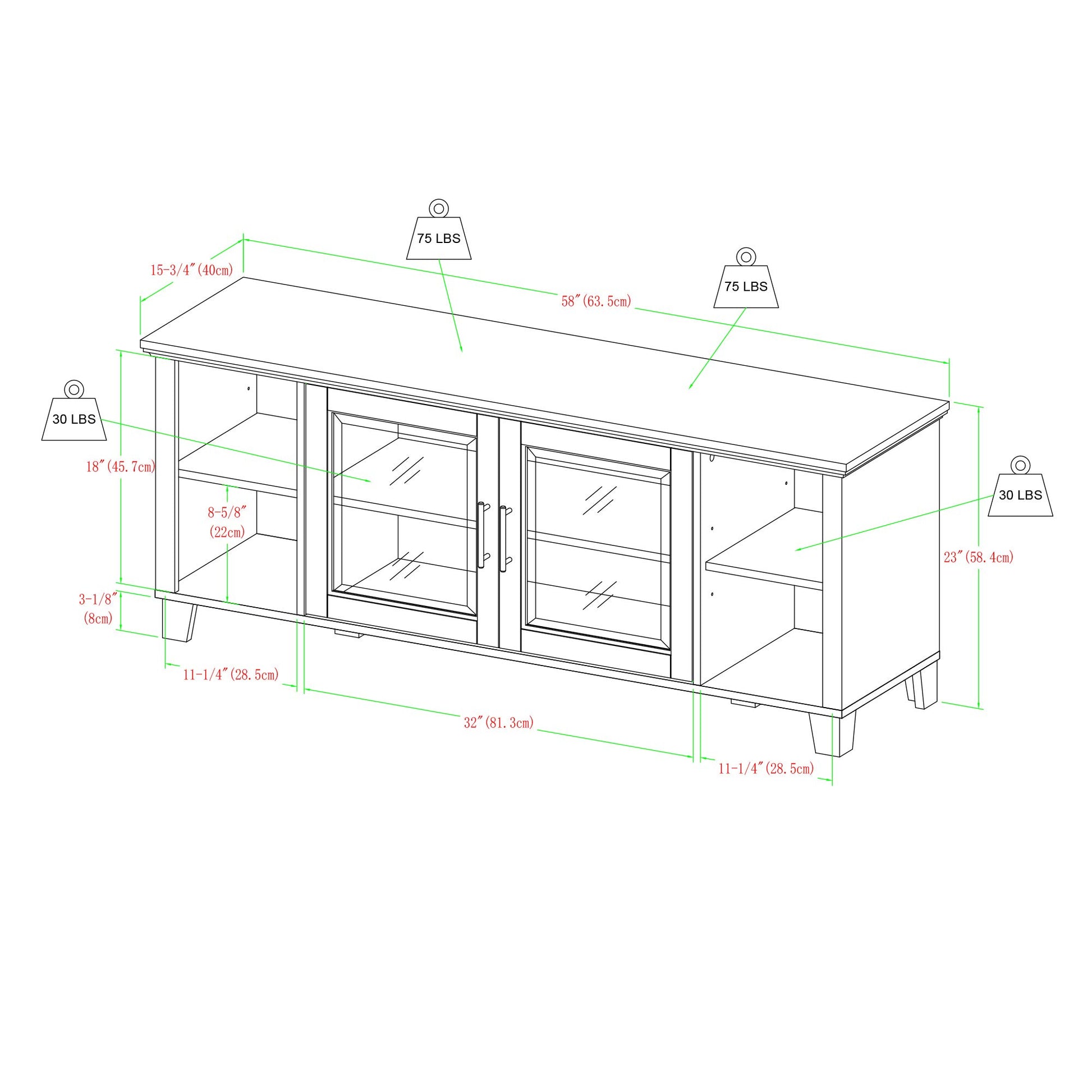 - Dimensions: 23” H x 15.75” D x 58” L, Open storage cubby: 8.625” H x 15.75” D x 11.25” L