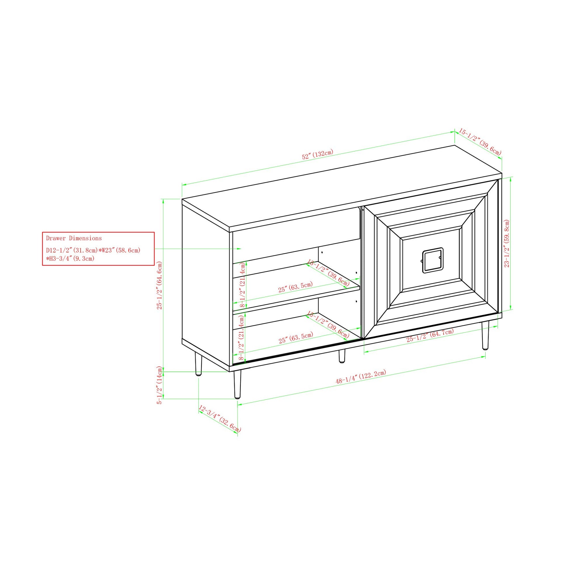- Dimensions: 30.75" H x 52" L x 15.5" W