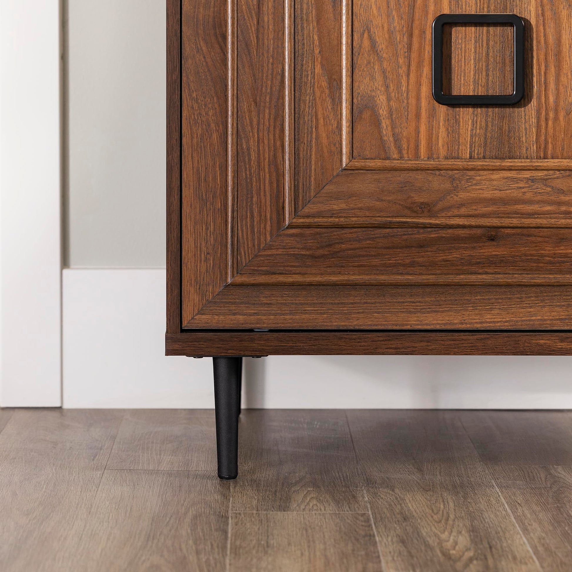 - Cable management features to run cords in the back of the TV stand