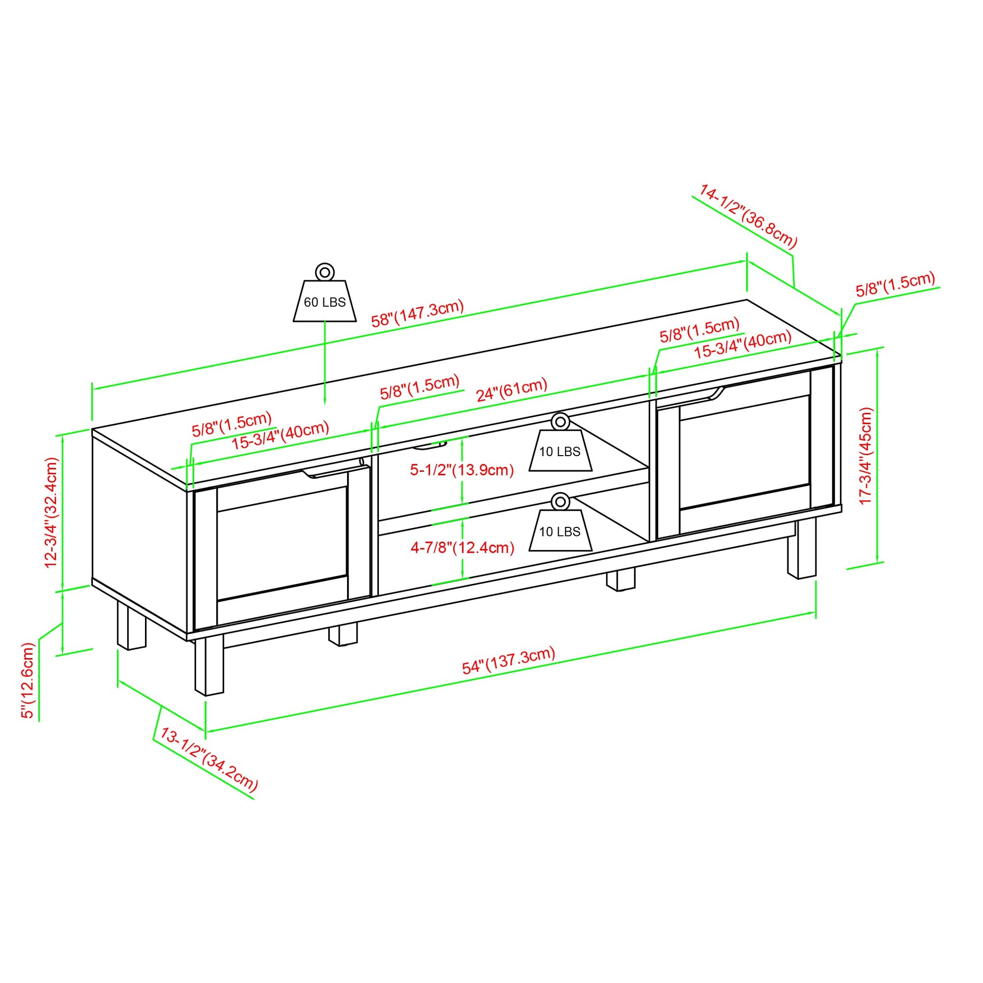 - Channel surf in style with the modern, easy breezy aesthetic of this TV stand. Curate an epic entertainment hub with a low profile that leaves room to display décor or show off your wall-mounted TV. Use the open middle shelves to display your sound bar, streaming devices, or favorite framed photos while you conceal clutter behind the minimalist, framed doors. With sleek finger pulls on each door and cord management ports, your entertainment center will be organized and ready to host a soiree or solo streaming sesh with contemporary finesse.