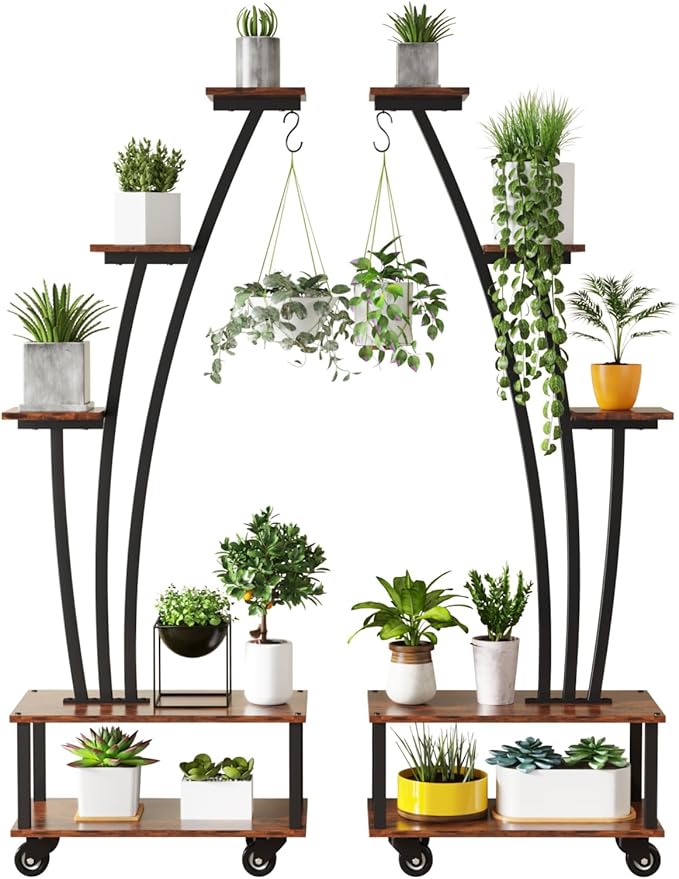 - The Walmokid Tiered Plant Stand features a dual 5-tier design with ample storage and display space, designed to provide each plant with maximum sunlight exposure. Two hooks on the top of the stand hold hanging plants. Whether you have a collection of small potted plants or larger decorative items, this stand will accommodate them all.
