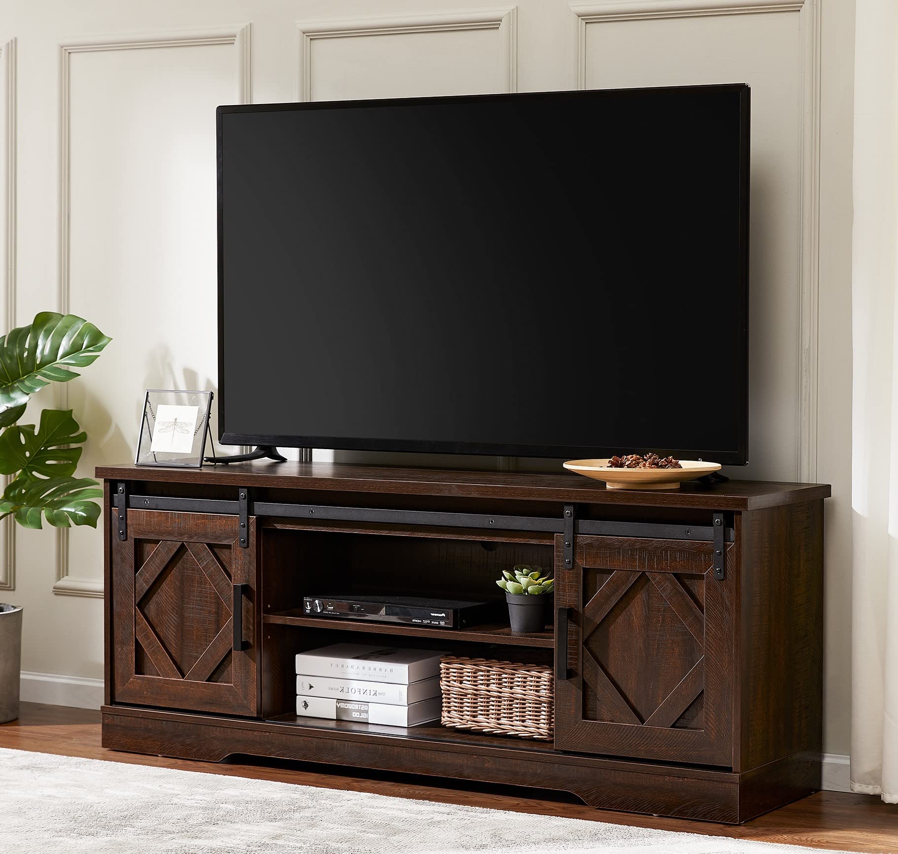 - FARMHOUSE BARN-DOOR DESIGN TV stands crafted from finest wood grain surface and featured barn doors that slide easily, allowing easy access to all necessities. Suitable for all the decor style and increase aesthetic for your living room.
