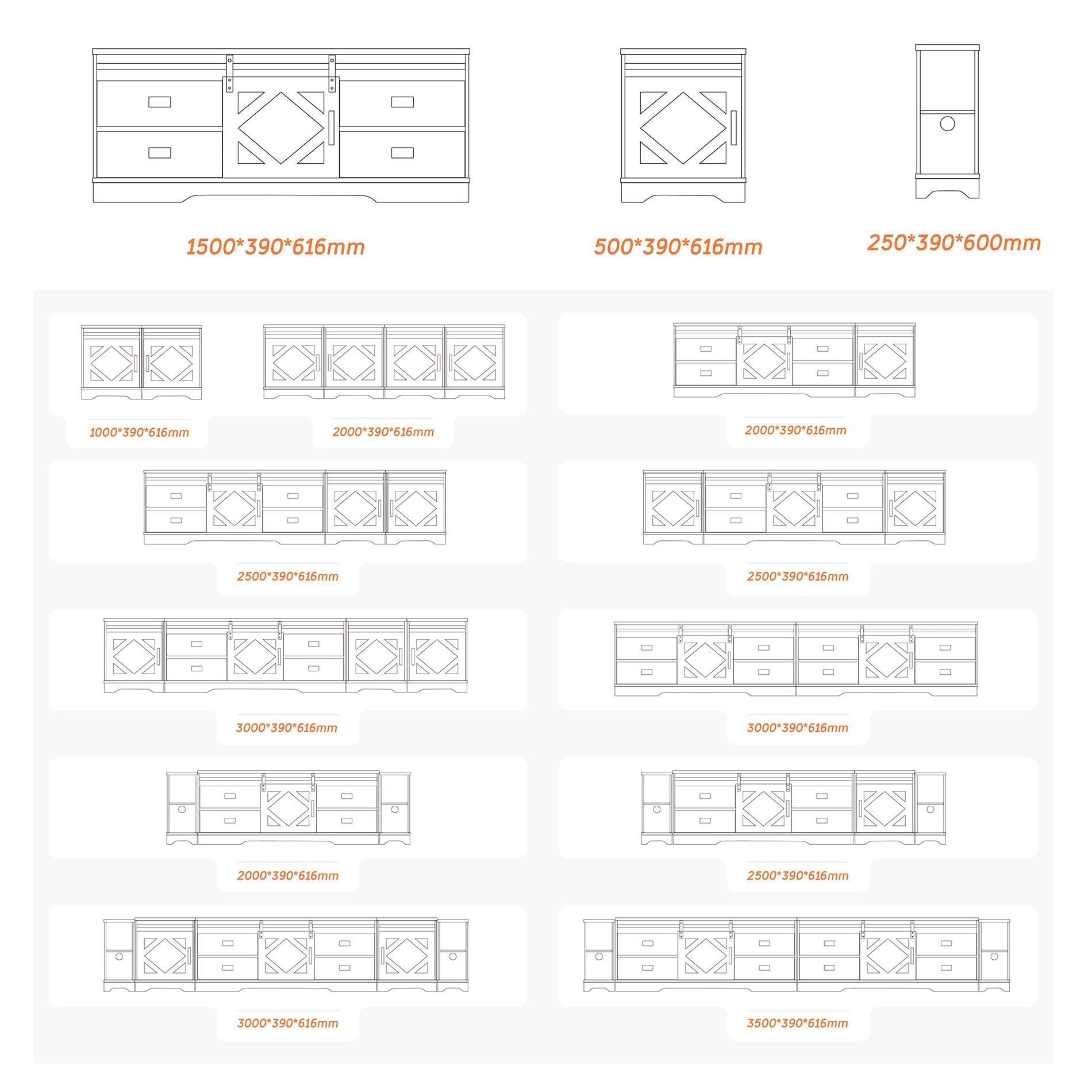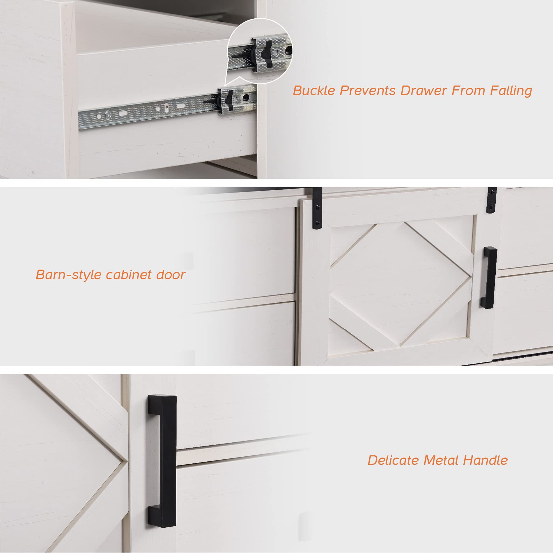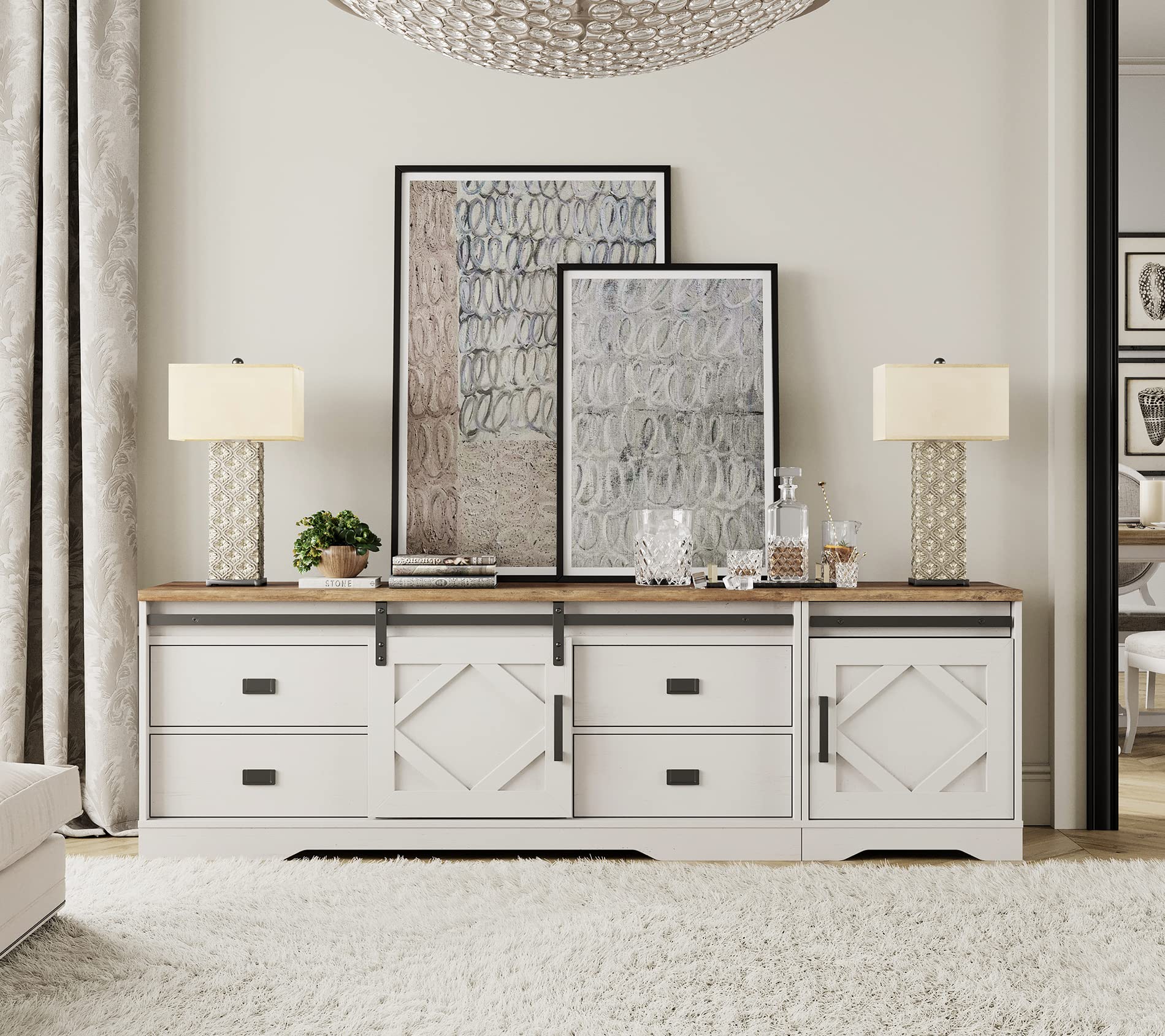 - This media console comes with one cabinet storage space with/ barn doors and a removable shelf in the middle and 4 drawers, providing abundant storage or display space for CDs, DVDs, gaming boxes, decorations, etc. Sliding barn doors on the TV stand for convenient access to cabinets while space-saving. You can also choose to slide the door to any side of the TV console for a clean, organized look.