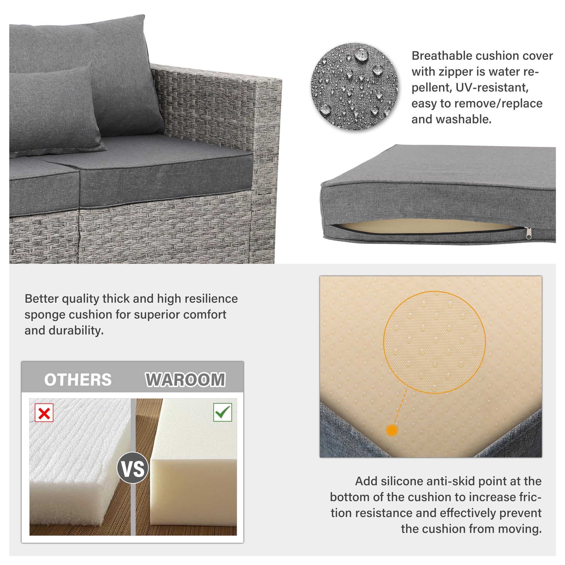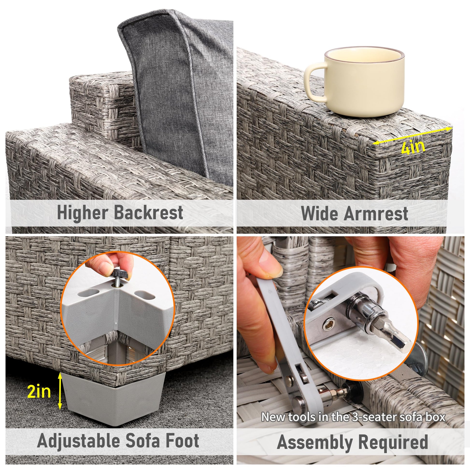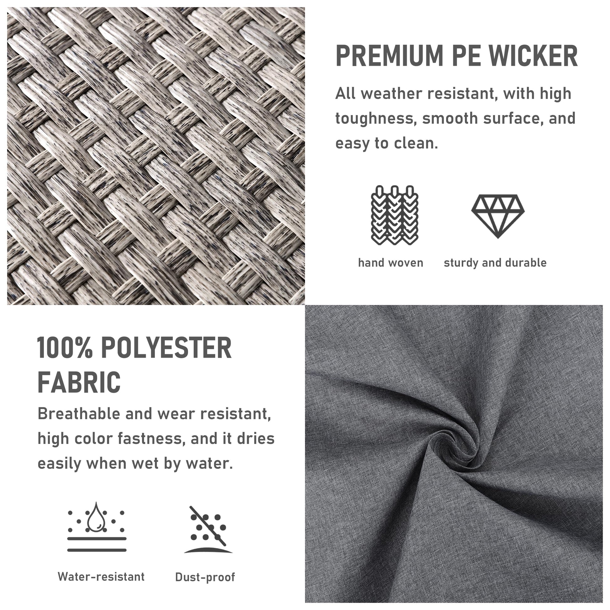 - HIGH QUALITY: This patio furniture is constructed from rust-resistant steel frame and all-weather PE rattan which is sturdy and durable, can ensure it is used for a long time. Upgraded premium rattan and new fabrics make the furniture more unique and elegant. The non-slip seat cushions are filled with a 4" thick high resilience sponge for superb comfort and relaxation, breathable cushion cover with a zipper is wear-resistant, water repellent, UV-resistant, and high color fastness.