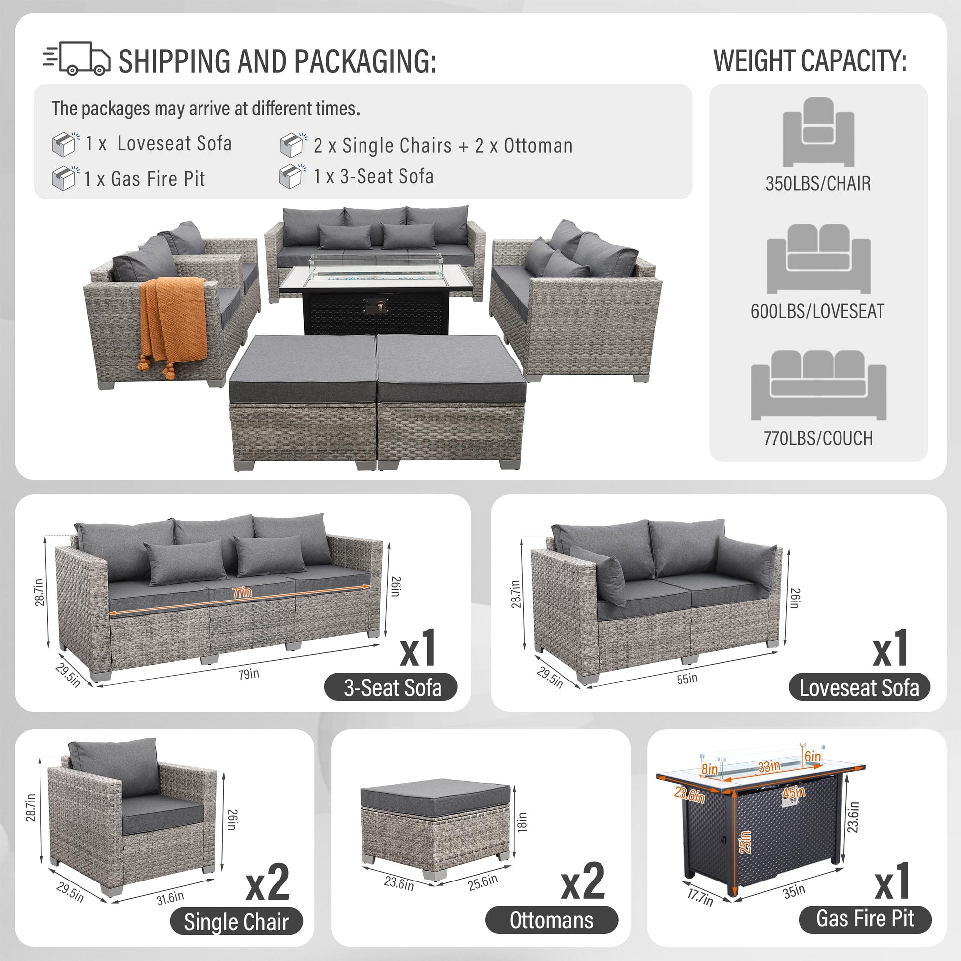 - FREELY COMBINATION: 7 pieces outdoor sectional sofa includes 1 couch(3-seater), 1 loveseat, 2 armchairs, 2 ottomans, and 1 firepit table. Modern and simple design suitable for any decoration style, a variety of different combinations can be adapted to any space, whether indoor or outdoor, such as patio, porch, backyard, deck, poolside, garden, lawn, etc.