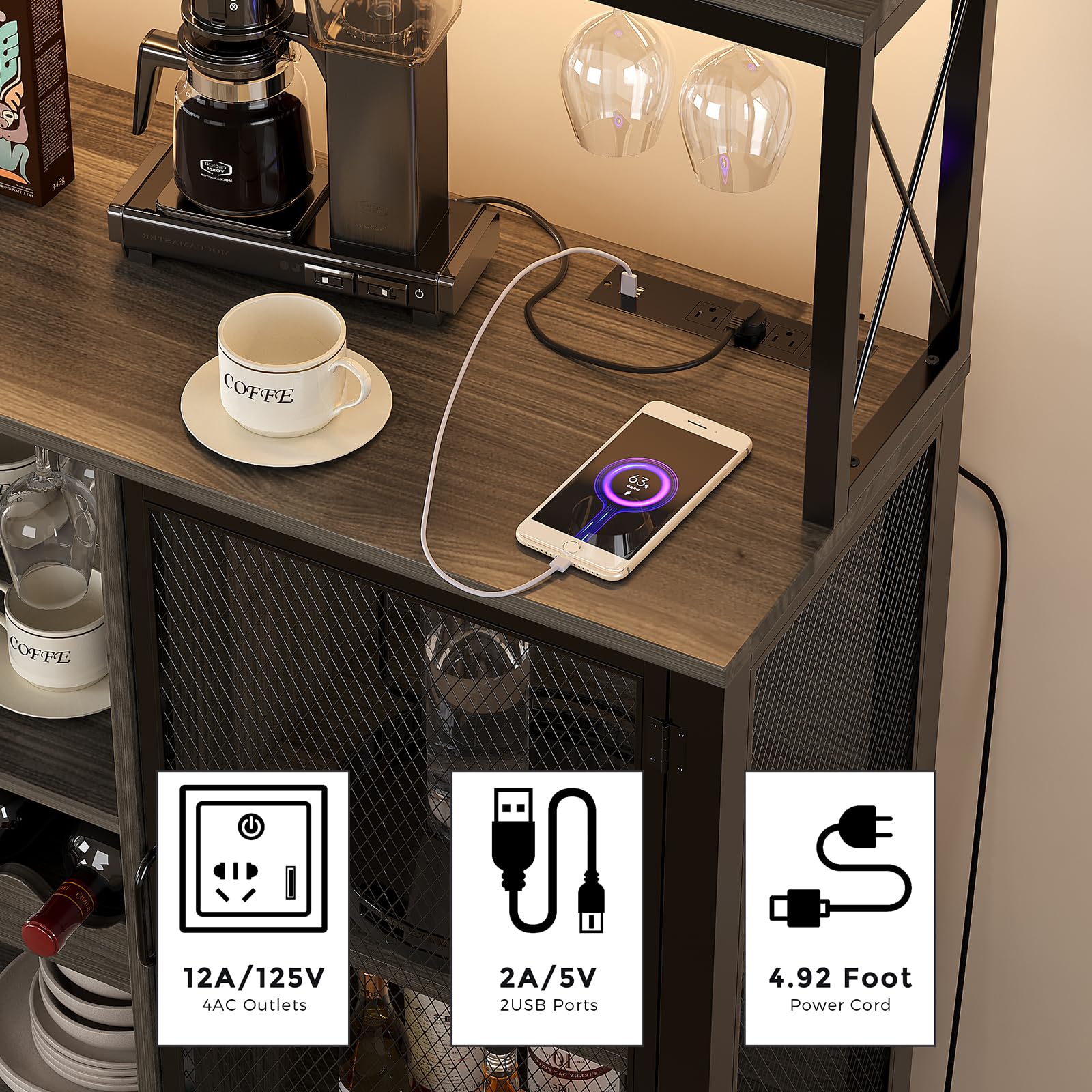 - Wine Bar Cabinets equipped with LED strips with RGB function, This Wine Bar Cabinet with storage provide 8 different colors, and RGB lighting helps to create the right atmosphere when drinking wine. WASAGUN bar cabinet with wine rack Storage has two sockets and two USB ports, which can easily provide power for the Coffee Machine, Ice Maker, etc.