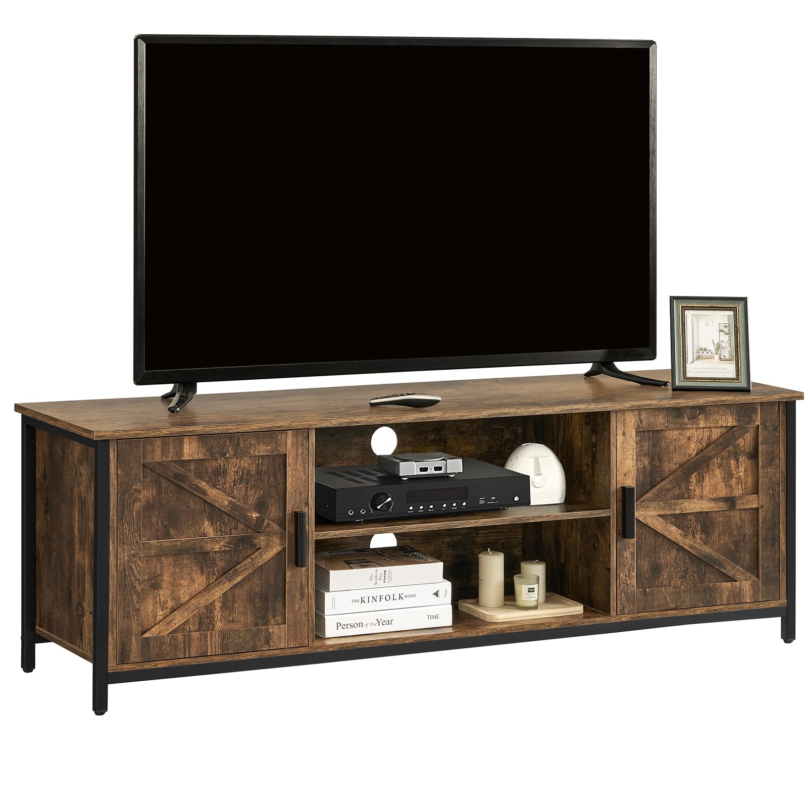 - The popular 59-inch tv stand size is suitable for the most common 65-inch large TV on the market. The rustic brown farmhouse barn door cabinet, as the entertainment center of your living room, is definitely practical and eye-catching!Built for long-lasting use, the outer frame is reinforced with a metal frame to ensure stability and strength when installed properly. Crafted from P2 particle wood, this material is durable, light-weight and easy to maintain. It's sure to last you a long time without compromising on its quality.
