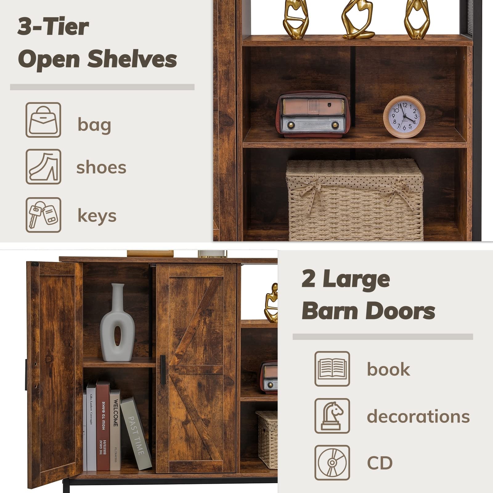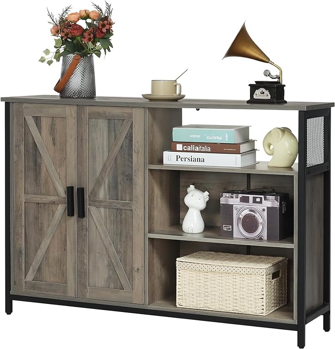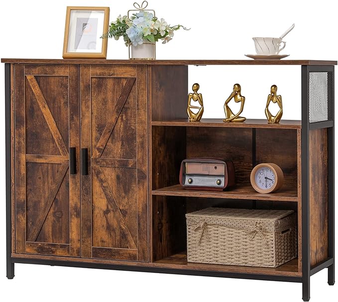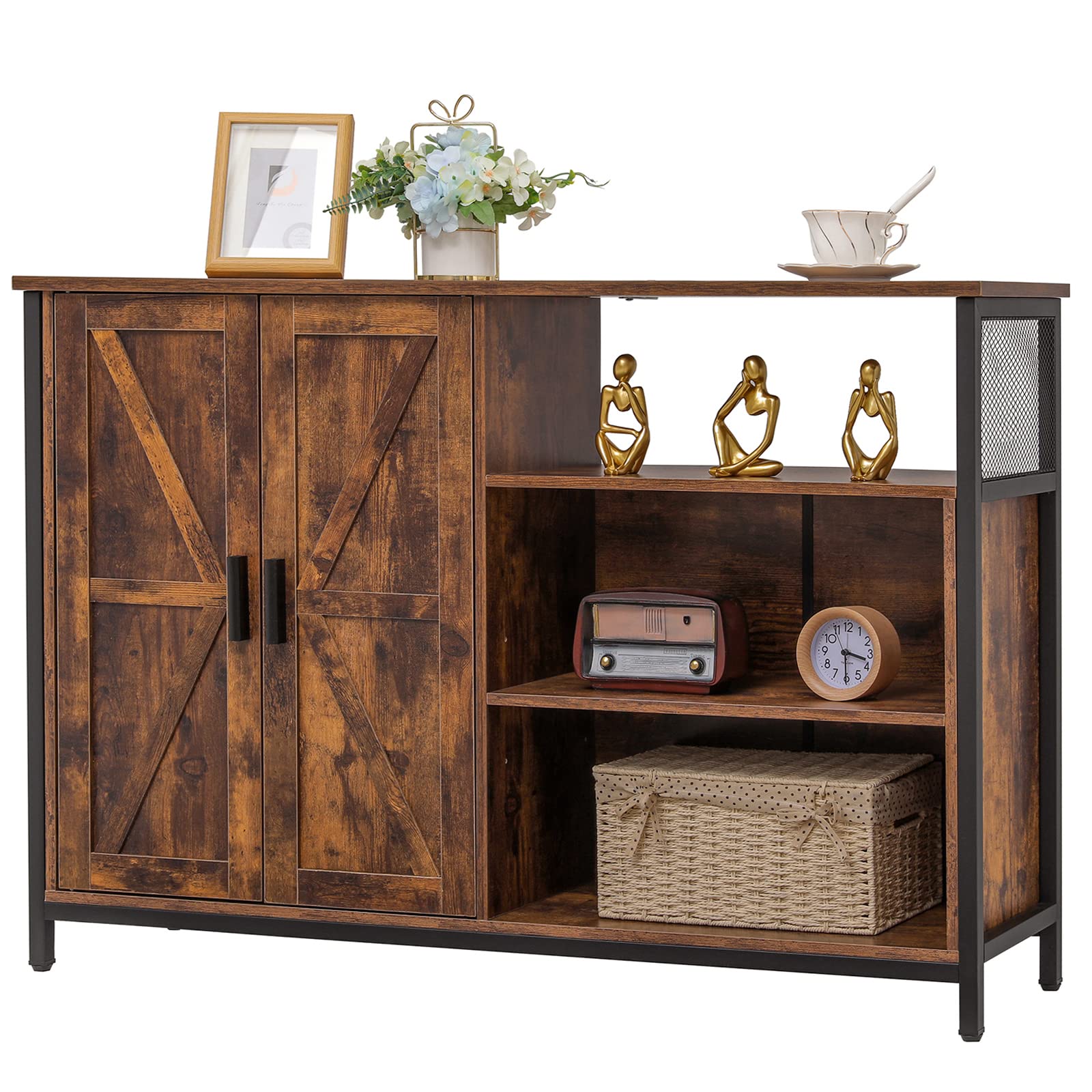 - Just The Right Fit - plenty of storage for your home. Buffet storage cabinet, from the barn doors to the adjustable shelves can be use according to your needs. The spacious tabletop is suitable for placing tea cups, laptops, albums, vases, etc. The open shelves allows you to easily access items without obstacle, while providing additional storage and display space for books, sundries basket and crafts