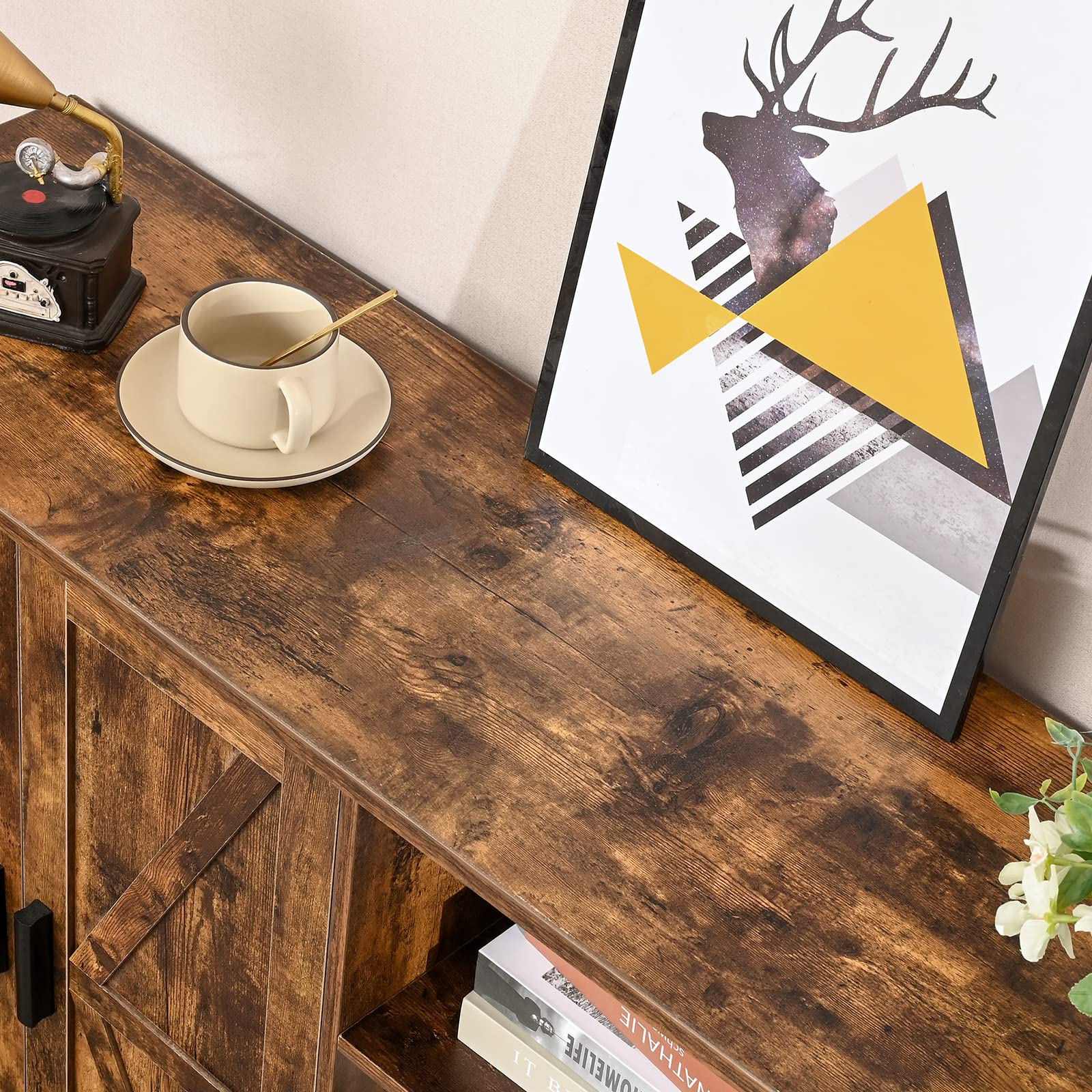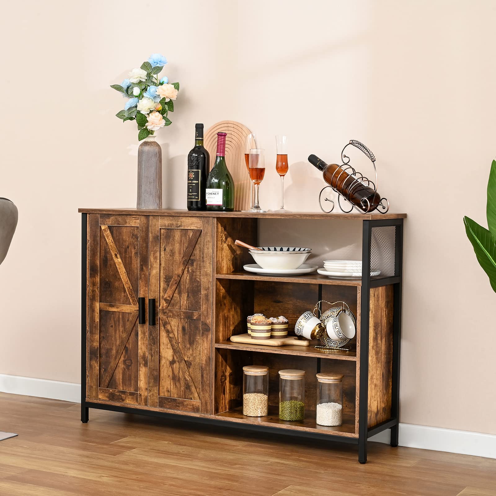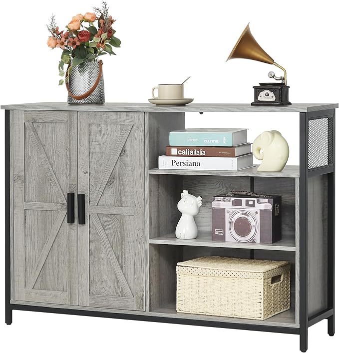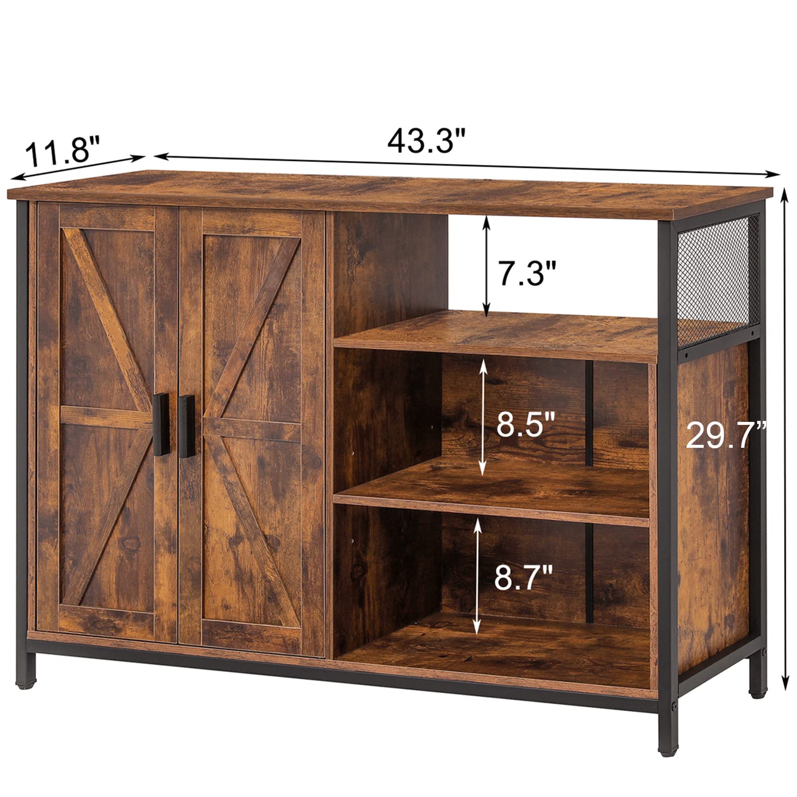 - Just The Right Fit - plenty of storage for your home. Buffet storage cabinet, from the barn doors to the adjustable shelves can be use according to your needs. The spacious tabletop is suitable for placing tea cups, laptops, albums, vases, etc. The open shelves allows you to easily access items without obstacle, while providing additional storage and display space for books, sundries basket and crafts